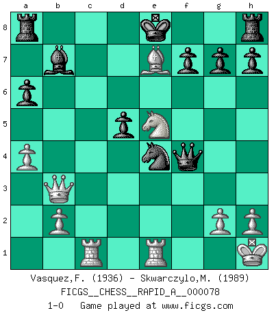 Last move : 1-0 2010 June 1 15:30:8 [Event "FICGS__CHESS__RAPID_A__000078"] [Site "FICGS"] [Date "2010.03.12"] [Round "1"] [White "Vasquez,Fernando"] [Black "Skwarczylo,Marek"] [Result "1-0"] [WhiteElo "1936"] [BlackElo "1989"] 1.e4 c5 2.d4 cxd4 3.c3 dxc3 4.Nxc3 Nc6 5.Nf3 e6 6.Bc4 a6 7.O-O b5 8.Bb3 Bb7 9.Re1 d6 10.a4 b4 11.Nd5 Na5 12.Nxb4 Qb6 13.Bd5 Be7 14.Be3 Qxb4 15.Bd2 Qc5 16.Rc1 Qa7 17.Bxa5 exd5 18.e5 dxe5 19.Nxe5 Nf6 20.Bb4 Ne4 21.Bxe7 Qxf2+ 22.Kh1 Qf4 23.Qb3 1-0 Sicilian : Smith-Morra gambit Kingside Castling by player White (move 7) Player White won this chess game. Follow this game move after move (download)Life is a kind of Chess, with struggle, competition, good and ill events. (Benjamin Franklin) Strategie ist, wie man ein Mädchen auf den Rücksitz bekommt. Taktik ist, was man tut, wenn man dann dort ist. (Anonymous) Entre mas años cumplo, mas valoro los Peones. (Keres) Les Echecs ne sont pas pour les âmes timides. Ils requièrent un homme entier, qui ne s'arrête pas aveuglément à ce qui a été déjà établi, mais qui tente individuellement de sonder les profondeurs du jeu. (W. Steinitz) At last I discovered the true beauty of chess. So I proposed to her. (Dinesh De Silva)