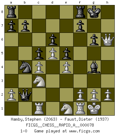 Last move : 1-0 2010 April 12 10:42:16 [Event "FICGS__CHESS__RAPID_A__000078"] [Site "FICGS"] [Date "2010.03.12"] [Round "1"] [White "Hamby,Stephen"] [Black "Faust,Dieter"] [Result "1-0"] [WhiteElo "2063"] [BlackElo "1937"] 1.d4 Nf6 2.c4 g6 3.Nc3 Bg7 4.e4 d6 5.Nf3 O-O 6.Be2 Na6 7.Bg5 c5 8.d5 e5 9.O-O Bd7 10.Qd2 Qb6 11.Ne1 h6 12.Bxh6 Bxh6 13.Qxh6 Qxb2 14.Rc1 Nb4 15.Qe3 Ng4 16.Bxg4 Bxg4 17.Qh6 1-0 King's Indian : Kazakh variation Kingside Castling by player Black (move 5) Kingside Castling by player White (move 9) Player White won this chess game. Follow this game move after move (download)To avoid losing a piece, many a person has lost the game. (Savielly Tartakover) Später, ... hatte ich zunehmend Erfolg in entscheidenden Partien. Vielleicht weil ich eine einfache Wahrheit erkannte: nicht nur ich hatte Angst, auch mein Gegner. (Mikhail Nekhemyevich Tal) El Ajedrez se juega con la mente... ¡no con las manos!. (Renaud y Kahn) Si le désir cupide (et stupide) de gagner est une inépuisable source de souffrance, une combinaison brillante sur l'échiquier est une découverte : le coquelicot qui s'épanouit lorsque apparaît la Voie Lactée. (Arrabal) The project of the man are lower than those of the sky. (Chinese proverb)