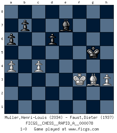 Last move : 1-0 2010 May 28 14:11:11 [Event "FICGS__CHESS__RAPID_A__000078"] [Site "FICGS"] [Date "2010.03.12"] [Round "1"] [White "Muller,Henri-Louis"] [Black "Faust,Dieter"] [Result "1-0"] [WhiteElo "2034"] [BlackElo "1937"] 1.e4 c5 2.Nf3 d6 3.d4 cxd4 4.Nxd4 Nf6 5.Nc3 a6 6.Bg5 e6 7.f4 Be7 8.Qf3 h6 9.Bh4 Nbd7 10.O-O-O Qc7 11.Bd3 g5 12.fxg5 Ne5 13.Qe2 Nfg4 14.Nf3 hxg5 15.Bg3 Nxf3 16.gxf3 Ne5 17.f4 gxf4 18.Bxf4 Bd7 19.Kb1 Bc6 20.Qf2 Nxd3 21.Rxd3 O-O-O 22.Bg3 Rdf8 23.Nd5 Bxd5 24.exd5 Kb8 25.Rc3 Qd7 26.Qb6 Qd8 27.Qxd8+ Rxd8 28.Rf1 Rdf8 29.Rcf3 Kc8 30.Rxf7 exd5 31.Rxf8+ Rxf8 32.Rxf8+ Bxf8 33.Kc1 Kd7 34.Kd2 Ke6 35.Ke3 Kf5 36.Kd4 Ke6 37.b3 Be7 38.Ke3 Kf5 39.a4 Bg5+ 40.Kf3 Be7 41.h3 Kg5 42.c4 dxc4 43.bxc4 1-0 Sicilian : Najdorf, 7...Be7 Queenside Castling by player White (move 10) Queenside Castling by player Black (move 21) 10 pieces endgame at move 43 : White KBPPP , Black KBPPP WHITE : King + 1 Bishop 3 Pawns BLACK : King + 1 Bishop 3 Pawns Player White won this chess game. Follow this game move after move (download)Everything is in a state of flux, and this includes the world of Chess. (Mikhail Botvinnik) Ich verstehe mehr vom Schach als irgendein anderer lebender Meister. (José Raúl Capablanca) ¿Esta Bobby Fischer algo cuerdo?. (Salo Flohr) Le jeu d'échecs est comme rejeté hors du temps. (Antoine de Saint-Exupéry) Opportunities multiply as they are seized. (Sun Tzu)