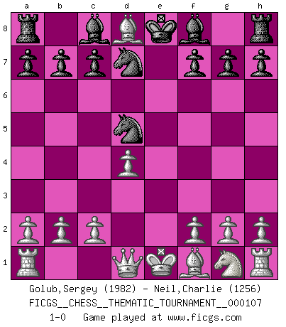 Last move : 1-0 2010 March 25 22:17:4 [Event "FICGS__CHESS__THEMATIC_TOURNAMENT__000107"] [Site "FICGS"] [Date "2010.03.12"] [Round "1"] [White "Golub,Sergey"] [Black "Neil,Charlie"] [Result "1-0"] [WhiteElo "1982"] [BlackElo "1256"] 1.e4 e6 2.d4 d5 3.Nc3 Nf6 4.Bg5 Nbd7 5.exd5 exd5 6.Nxd5 Nxd5 7.Bxd8 1-0 French defense Player White won this chess game. Follow this game move after move (download)It was clear to me that the vulnerable point of the American Grandmaster (Bobby Fischer) was in double-edged, hanging, irrational positions, where he often failed to find a win even in a won position. (Efim Geller) Kritik überlasse ich den Spießern. Ich zeige nichts, wofür ich mich schämen muss. (Alexandra Kosteniuk) Para mi, el Ajedrez es la vida y cada partida es como una nueva vida. Todo jugador de Ajedrez suele vivir muchas vidas durante su vida. (Eduard Gufeld) Des points faibles ou des trous dans la position de l'adversaire doivent être occupés par des pièces et non pas par des pions. (Siegbert Tarrasch) There are lots of people who mistake their imagination for their memory. (Josh Bilings)