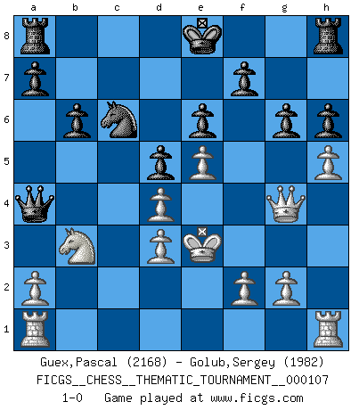 Last move : 1-0 2010 June 30 21:12:11 [Event "FICGS__CHESS__THEMATIC_TOURNAMENT__000107"] [Site "FICGS"] [Date "2010.03.12"] [Round "1"] [White "Guex,Pascal"] [Black "Golub,Sergey"] [Result "1-0"] [WhiteElo "2168"] [BlackElo "1982"] 1.e4 e6 2.d4 d5 3.Nc3 Nf6 4.Bg5 Bb4 5.e5 h6 6.Bd2 Bxc3 7.bxc3 Ne4 8.Qg4 g6 9.Bd3 Nxd2 10.Kxd2 c5 11.Nf3 Nc6 12.h4 cxd4 13.cxd4 Qa5+ 14.Ke3 b6 15.Nd2 Ba6 16.Nb3 Qa4 17.h5 Bxd3 18.cxd3 1-0 This chess game has been lost on time (started : 2010.03.12 13:15:1) French : MacCutcheon, Lasker variation Player White won this chess game. Follow this game move after move (download)When I have White, I win because I am white; When I have Black, I win because I am Bogolyubov. (Bogolyubov) Schach ist Krieg, im Schach geht es um testosterongesteuerte Urschreie. (Garry Kasparov) Yo he agregado estos principios a la ley: pongan los Caballos en acción antes de que los dos Alfiles sean desarrollados. (Emanuel Lasker) RxDa4 pat (...) If we don't succeed, we run the risk of failure. (George W. Bush)