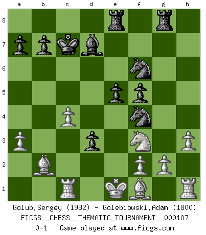 Last move : 0-1 2010 August 7 10:13:54 [Event "FICGS__CHESS__THEMATIC_TOURNAMENT__000107"] [Site "FICGS"] [Date "2010.03.12"] [Round "1"] [White "Golub,Sergey"] [Black "Golebiowski,Adam"] [Result "0-1"] [WhiteElo "1982"] [BlackElo "1800"] 1.e4 e6 2.d4 d5 3.Nc3 Bb4 4.e5 c5 5.a3 Bxc3+ 6.bxc3 Qc7 7.Qg4 f5 8.Qg3 Ne7 9.Qxg7 Rg8 10.Qxh7 cxd4 11.Kd1 Bd7 12.Qh5+ Kd8 13.Ne2 dxc3 14.Qf3 Nbc6 15.Qxc3 Nxe5 16.Qxc7+ Kxc7 17.Nd4 Ng4 18.Ke1 e5 19.Nf3 Rae8 20.h3 Nf6 21.Bb2 d4 22.c3 Ned5 23.Rc1 d3 24.c4 Nf4 0-1 This chess game has been lost on time (started : 2010.03.12 13:15:1) French : Winawer, Classical variation Player Black won this chess game. Follow this game move after move (download)My God, Bobby Fischer plays so simply. (Alexei Suetin) Ich habe kein Problem mit Frauen, sondern nur mit dem Niveau ihres Schachspiels (Judith Polgar) En el tablero, la mentira e hipocresía no sobreviven mucho. (Emanuel Lasker) Donnez-moi un Cavalier en 6e et je gagnerais toutes mes parties. (Steinitz) Luck is the residue of design. (John Milton)