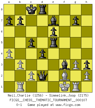 Last move : 0-1 2010 April 20 23:4:39 [Event "FICGS__CHESS__THEMATIC_TOURNAMENT__000107"] [Site "FICGS"] [Date "2010.03.12"] [Round "1"] [White "Neil,Charlie"] [Black "Simmelink,Joop"] [Result "0-1"] [WhiteElo "1256"] [BlackElo "2175"] 1.e4 e6 2.d4 d5 3.Nc3 Nc6 4.e5 Nge7 5.f4 Nf5 6.Nf3 h5 7.Bd2 Ncxd4 8.Nxd4 Nxd4 9.Ne2 Nc6 10.Bc3 Be7 11.Nd4 Nxd4 12.Bxd4 c5 13.Bf2 Qb6 14.Qc1 h4 15.Be2 h3 16.g3 Bd7 17.Rb1 d4 18.b3 O-O-O 19.Rg1 f6 20.Bf1 fxe5 21.fxe5 Rh5 22.Be2 Rxe5 23.Qd2 Bb5 24.a4 Bxe2 25.Qf4 Qb4+ 26.Qd2 Bf3 27.Kf1 Qxd2 0-1 French : Paulsen variation Queenside Castling by player Black (move 18) Player Black won this chess game. Follow this game move after move (download)When in doubt... play Chess ! (Tevis) Bogoljubow: Matt in vier Zügen! Tartakower: Ich verbitte mir jede Belästigung! (Savielly Grigorievitsch Tartakower) Muchos se han convertido en Maestros de Ajedrez, nadie se ha convertido en el Maestro del Ajedrez. (Siegbert Tarrasch) Je fais ceci parce que dans cinquante coups j'obtiendrai cela; je m'appelle Mikhail Moisevitch Botvinnik. (Botvinnik) Happy endings are just stories that haven't finished yet. (Jane Smith in Mr & Mrs Smith)