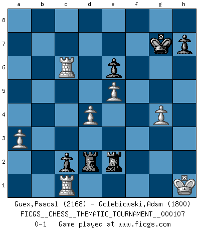 Last move : 0-1 2010 August 30 22:52:13 [Event "FICGS__CHESS__THEMATIC_TOURNAMENT__000107"] [Site "FICGS"] [Date "2010.03.12"] [Round "1"] [White "Guex,Pascal"] [Black "Golebiowski,Adam"] [Result "0-1"] [WhiteElo "2168"] [BlackElo "1800"] 1.e4 e6 2.d4 d5 3.Nc3 Bb4 4.e5 c5 5.a3 Bxc3+ 6.bxc3 Qa5 7.Bd2 Qa4 8.Qg4 g6 9.Qd1 b6 10.h4 Ba6 11.Bxa6 Nxa6 12.h5 cxd4 13.hxg6 fxg6 14.Rh4 Ne7 15.cxd4 Nc5 16.Bb4 Ne4 17.f3 Ng3 18.Rh3 Ngf5 19.Qd2 Nc6 20.c3 Nxb4 21.cxb4 Rc8 22.Ne2 O-O 23.g4 Ne7 24.Qd1 Qb5 25.Kf2 Rc4 26.Rb1 Rf7 27.Kg2 a5 28.Qd2 Qa4 29.bxa5 Rc2 30.Qd3 Qc4 31.Qxc4 dxc4 32.axb6 Rxe2+ 33.Kf1 Ra2 34.b7 Nc6 35.b8Q+ Nxb8 36.Rxb8+ Kg7 37.Rb1 g5 38.Rc1 Rb7 39.f4 gxf4 40.Rf3 R7b2 41.Rxf4 c3 42.Rf3 Rh2 43.Kg1 Rag2+ 44.Kf1 Rd2 45.Kg1 c2 46.Rc3 Rdg2+ 47.Kf1 Rf2+ 48.Kg1 Rhg2+ 49.Kh1 Rd2 50.Rc6 Rge2 0-1 French : Winawer, Advance variation Kingside Castling by player Black (move 22) Promotion Queen by player White (move 35) Player Black won this chess game. Follow this game move after move (download)I had a toothache during the first game. In the second game I had a headache. In the third game it was an attack of rheumatism. In the fourth game, I wasn't feeling well. And in the fifth game? Well, must one have to win every game ? (Siegbert Tarrasch) Wenn Du absolut nicht mehr weißt, was Du tun sollst, dann ist es Zeit für Panik. (John van der Wiel) El Ajedrez es tan interesante por sí solo, que no es necesario un interés monetario para persuadir a una persona a que lo practique; por lo tanto, nunca se juega por dinero. (Benjamin Franklin) Si le désir cupide (et stupide) de gagner est une inépuisable source de souffrance, une combinaison brillante sur l'échiquier est une découverte : le coquelicot qui s'épanouit lorsque apparaît la Voie Lactée. (Arrabal) The large trees attract high winds. (Chinese proverb)