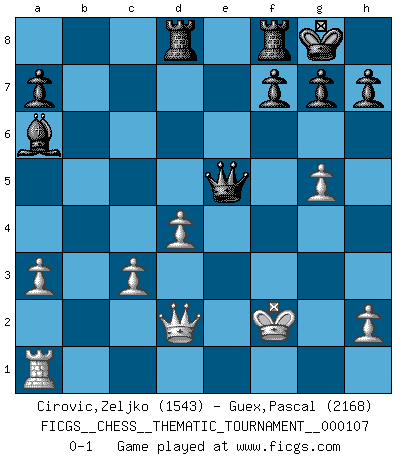 Last move : 0-1 2010 April 25 14:48:23 [Event "FICGS__CHESS__THEMATIC_TOURNAMENT__000107"] [Site "FICGS"] [Date "2010.03.12"] [Round "1"] [White "Cirovic,Zeljko"] [Black "Guex,Pascal"] [Result "0-1"] [WhiteElo "1543"] [BlackElo "2168"] 1.e4 e6 2.d4 d5 3.Nc3 Bb4 4.e5 c5 5.a3 Bxc3+ 6.bxc3 Ne7 7.Nf3 Nbc6 8.Bb5 Qa5 9.Bxc6+ bxc6 10.Bd2 Ba6 11.c4 Qa4 12.cxd5 cxd5 13.dxc5 Qe4+ 14.Be3 Nf5 15.Qd2 d4 16.Nxd4 Rd8 17.c3 Qxe5 18.g4 Nxe3 19.fxe3 Qxc5 20.Kf2 e5 21.Rhe1 O-O 22.g5 exd4 23.exd4 Qd5 24.Re5 Qxe5 0-1 French : Winawer, Advance, positional Main line Kingside Castling by player Black (move 21) Player Black won this chess game. Follow this game move after move (download)Fischer is under obligation to nobody. (Joseph Platz) Schachspieler können ausgezeichnet Varianten am Schachbrett berechnen, aber nicht im realen Leben. Zu stark ist der Individualismus im Schach ausgeprägt, und für viele ist ein kleiner momentaner persönlicher Vorteil wichtiger als ein weit größerer Vorteil von morgen. (Anatoly Karpov) Los Peones son nacidos libres, y aún así, se encuentran encadenados por todos lados. (Rick Kennedy) Fischer est le meilleur joueur du monde et Karpov n'est qu'un joueur de bistrot. (Garry Kasparov, agé de 16 ans) Looking at the proliferation of personal web pages on the Net, it looks like very soon everyone on Earth will have 15 megabytes of fame. (M.G. Sriram)