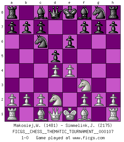 Last move : 1-0 2010 April 3 10:42:52 [Event "FICGS__CHESS__THEMATIC_TOURNAMENT__000107"] [Site "FICGS"] [Date "2010.03.12"] [Round "1"] [White "Makosiej,Wladyslaw"] [Black "Simmelink,Joop"] [Result "1-0"] [WhiteElo "1481"] [BlackElo "2175"] 1.e4 e6 2.d4 d5 3.Nd2 Nc6 4.Ngf3 1-0 French : Tarrasch, Guimard variation Player White won this chess game. Follow this game move after move (download)I like the moment when I break a man's ego. (Bobby Fischer) Das Schachspiel hat wie die Liebe, die Musik, die Fähigkeit, den Menschen glücklich zu machen. Ich habe ein leises Gefühl des Bedauerns für jeden, der das Schachspiel nicht kennt, so wie ich jeden bedaure, der die Liebe nicht kennt. (Siegbert Tarrasch) Si un gobernante no entiende al Ajedrez, ¿como puede governar él un reinado?. (El Rey Khusros II) La vie est comme un jeu d'échecs : nous esquissons un plan, mais celui-ci est tributaire de ce que daignent faire l'adversaire aux échecs et le destin dans la vie. (Arthur Schopenhauer) I just play for fun. (Anna Kournikova)
