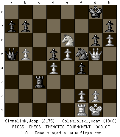 Last move : 1-0 2010 April 6 9:21:18 [Event "FICGS__CHESS__THEMATIC_TOURNAMENT__000107"] [Site "FICGS"] [Date "2010.03.12"] [Round "1"] [White "Simmelink,Joop"] [Black "Golebiowski,Adam"] [Result "1-0"] [WhiteElo "2175"] [BlackElo "1800"] 1.e4 e6 2.d4 d5 3.Nc3 Bb4 4.e5 c5 5.a3 Bxc3+ 6.bxc3 Qc7 7.Qg4 f5 8.Qg3 cxd4 9.cxd4 Ne7 10.Ne2 O-O 11.c3 Bd7 12.h4 Nbc6 13.h5 Rac8 14.h6 g6 15.Nf4 Na5 16.a4 Nb3 17.Rb1 Nxc1 18.Rxc1 Kf7 19.Bb5 Bxb5 20.axb5 Qa5 21.Nh3 f4 22.Qg4 Nf5 23.Ng5+ Kg8 24.Nxe6 Rxc3 25.O-O Rfc8 26.Rxc3 Rxc3 27.Qg5 1-0 French : Winawer, Classical variation Kingside Castling by player Black (move 10) Kingside Castling by player White (move 25) Player White won this chess game. Follow this game move after move (download)One doesn't have to play well, it's enough to play better than your opponent. (Siegbert Tarrasch) Den Ruhm habe ich schon, jetzt brauche ich noch das Geld. (Wilhelm Steinitz) El Ajedrez es realmente noventa y nueve por ciento calculación. (Soltis) On peut tirer plus d'utilité d'une partie perdue que de 100 parties gagnées. (Capablanca) Creativity involves breaking out of established patterns in order to look at things in a different way. (Edward De Bono)