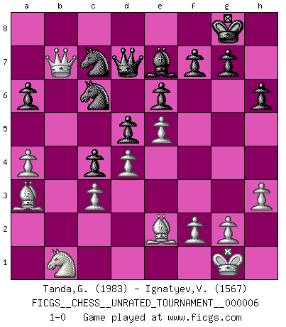 Last move : 1-0 2010 September 4 23:8:28 [Event "FICGS__CHESS__UNRATED_TOURNAMENT__000006"] [Site "FICGS"] [Date "2010.03.12"] [Round "1"] [White "Tanda,Giovanni"] [Black "Ignatyev,Vladimir"] [Result "1-0"] [WhiteElo "1983"] [BlackElo "1567"] 1.d4 d5 2.Nf3 e6 3.Bf4 c5 4.e3 Nc6 5.c3 Nf6 6.Nbd2 c4 7.Qc2 Bd7 8.h3 Be7 9.b3 b5 10.a4 a6 11.bxc4 bxc4 12.e4 O-O 13.Be2 Na5 14.O-O Ne8 15.Ne5 Bd6 16.Nxd7 Qxd7 17.e5 Be7 18.Rab1 Nc7 19.Rb2 Rab8 20.Rfb1 Nc6 21.Be3 Rxb2 22.Rxb2 Rb8 23.Rxb8+ Nxb8 24.Qb2 Nc6 25.Qb7 Ba3 26.Nb1 Be7 27.Bc1 h6 28.Ba3 1-0 Queen's pawn game Kingside Castling by player Black (move 12) Kingside Castling by player White (move 14) Player White won this chess game. Follow this game move after move (download)One bad move nullifies forty good ones. (Horowitz) Kein Schachspieler kann gut schlafen. (H. G. Wells) Un Peón pasado aumenta su poder a medida de que el número de piezas en el tablero disminuye. (Capablanca) Toutes les manuvres exécutées sur une colonne ouverte ont pour but ultime l'intrusion définitive sur la septième ou la huitième rangée, en plein cur de la position ennemie. (Aaron Nimzovitch) The Movers & Shakers of this world are those who play chess in the mornings and go to the disco in the evenings. (Dinesh De Silva)