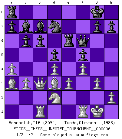 Last move : 1/2-1/2 2010 May 18 23:20:38 [Event "FICGS__CHESS__UNRATED_TOURNAMENT__000006"] [Site "FICGS"] [Date "2010.03.12"] [Round "1"] [White "Bencheikh,Ilf"] [Black "Tanda,Giovanni"] [Result "1/2-1/2"] [WhiteElo "2094"] [BlackElo "1983"] 1.d4 d5 2.c4 c6 3.Nc3 Nf6 4.e3 e6 5.Nf3 Nbd7 6.Be2 Bd6 7.O-O O-O 8.b3 Ne4 9.Qc2 f5 10.a4 Rf6 11.Ba3 Bb8 12.Rac1 b6 13.g3 Bb7 14.Nd2 Bc7 15.cxd5 Nxc3 16.Qxc3 exd5 17.f4 Re6 18.Bd3 Qf6 1/2-1/2 QGD Slav defense Kingside Castling by player White (move 7) Kingside Castling by player Black (move 7) This chess game ended in a draw. Follow this game move after move (download)You must take your opponent into a deep dark forest where 2+2=5, and the path leading out is only wide enough for one. (Mikhail Tal) Das Schach hält seine Meister in eigenen Banden, Fesseln; auf vielerlei Weise formt es ihren Geist, so dass die innere Freiheit selbst des Stärksten beeinflusst wird. (Albert Einstein) La caracteristica mas importante en la posición del Ajedrez es la actividad de las piezas. Esto es absolutamente fundamental en todas las fases del juego: Apertura, Juego Medio y especialmente Finales. La limitación primordial en la actividad de una pieza, es la estructuración de los Peones. (Michael Stean) Assurément je connaissais par expérience le mystérieux attrait de ce jeu royal, le seul entre tous les jeux inventés par les hommes qui échappe souverainement à la tyrannie du hasard, le seul où l'on ne doive sa victoire qu'à son intelligence ou plutôt à une certaine forme d'intelligence. Mais n'est-ce pas déjà le limiter injurieusement que d'appeler les échecs un jeu ? N'est-ce pas une science, un art ou quelque chose qui, comme le cercueil de Mahomet entre ciel et terre, est suspendu entre l'un et l'autre, et qui réunit un nombre incroyable de contraires ? [...] C'est une pensée qui ne mène à rien, une mathématique qui n'établit rien, un art qui ne laisse pas d'uvre, une architecture sans matière; et il l'a prouvé néanmoins qu'il était plus durable, à sa manière, que les livres ou que tout autre monument, ce jeu unique qui appartient à tous les peuples et à tous les temps, et dont personne ne sait quel dieu en fit don à la terre pour tuer l'ennui, pour aiguiser l'esprit et stimuler l'âme. Où commence-t-il, où finit-il ? (Stefan Zweig) Art is the only way to run away without leaving home. (Twyla Tharp)