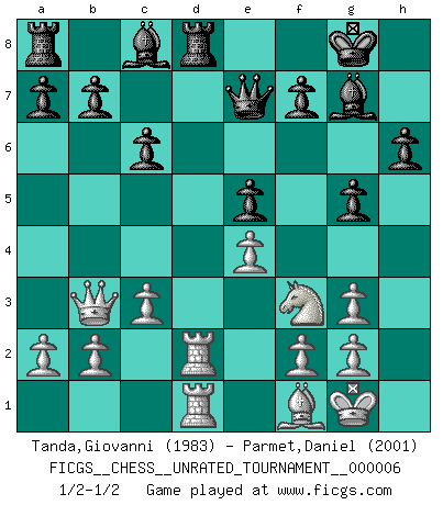 Last move : 1/2-1/2 2010 May 5 20:17:0 [Event "FICGS__CHESS__UNRATED_TOURNAMENT__000006"] [Site "FICGS"] [Date "2010.03.12"] [Round "1"] [White "Tanda,Giovanni"] [Black "Parmet,Daniel"] [Result "1/2-1/2"] [WhiteElo "1983"] [BlackElo "2001"] 1.d4 Nf6 2.Nf3 g6 3.Bg5 Bg7 4.Nbd2 O-O 5.c3 d6 6.e4 Nbd7 7.Be2 e5 8.dxe5 dxe5 9.O-O h6 10.Bh4 Qe8 11.Re1 Nh5 12.Bf1 g5 13.Bg3 Nxg3 14.hxg3 Nc5 15.Nb3 Nxb3 16.Qxb3 Qe7 17.Rad1 c6 18.Rd2 Rd8 19.Red1 1/2-1/2 King's Indian : Torre attack Kingside Castling by player Black (move 4) Kingside Castling by player White (move 9) This chess game ended in a draw. Follow this game move after move (download)A thorough understanding of the typical mating continuations makes the most complicated sacrificial combinations leading up to them not only not difficult, but almost a matter of course. (Siegbert Tarrasch) Es ist besser die Steine des Gegners zu opfern. (Savielly Grigorievitsch Tartakower) Aún el Rey más flojo huye despavorido ante la amenaza de un Jaque doble. (Aaron Nimzowitsch) Donnez-moi un Cavalier en 6e et je gagnerais toutes mes parties. (Steinitz) Luck never gives; it only lends. (Swedish proverb)