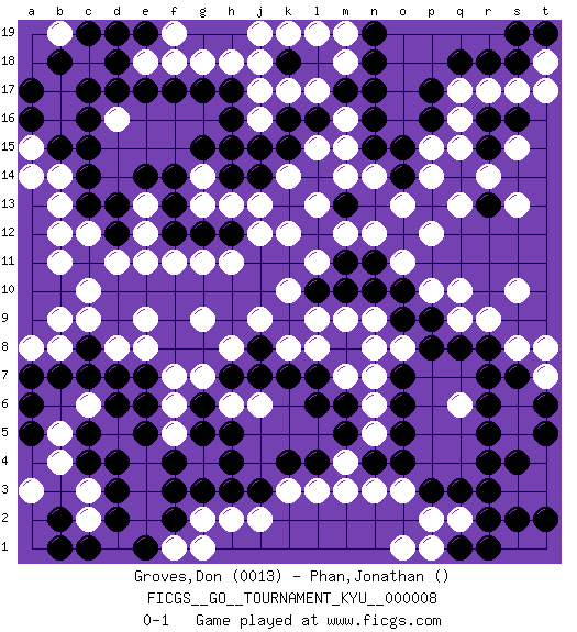 Last move : 0-1 2006 November 20 2:12:15 [Event "FICGS__GO__TOURNAMENT_KYU__000008"] [Site "FICGS"] [Date "2006.10.19"] [Round "1"] [Black "Groves,Don"] [White "Phan,Jonathan"] [Result "0-1"] [Rating 1 "0013"] 1.d4 q16 2.c16 q10 3.e17 k17 4.h17 j16 5.h15 j17 6.k4 h18 7.h16 b14 8.c13 b13 9.c14 b11 10.c11 c9 11.c7 b8 12.b7 e9 13.r5 g11 14.e7 b16 15.b15 a15 16.c15 b17 17.c17 c18 18.d18 b19 19.c19 d19 20.e19 c12 21.d12 b12 22.c19 d11 23.b18 c10 24.a17 e13 25.f14 g4 26.f3 f7 27.c8 b9 28.q3 d8 29.d7 e8 30.d13 e12 31.e14 f5 32.e5 c3 33.c4 b4 34.d3 c2 35.d2 b5 36.a7 a8 37.a6 c6 38.d6 a3 39.a5 f18 40.g17 g18 41.c1 j19 42.c5 e18 43.f17 d16 44.d17 g14 45.h14 g13 46.f13 k12 47.f12 e11 48.g12 h13 49.h12 j13 50.j14 h11 51.k15 m14 52.l16 l17 53.m17 m16 54.n16 m15 55.n17 l15 56.k16 f19 57.d19 m18 58.n18 l19 59.k18 j18 60.r15 k19 61.p17 p15 62.o15 p14 63.r16 q17 64.p16 q15 65.q18 r17 66.r18 s17 67.n15 n12 68.q8 n3 69.n4 l3 70.l4 o3 71.o4 q2 72.p3 p2 73.r2 k3 74.j3 j2 75.g3 m4 76.m5 m3 77.h4 h2 78.h3 s8 79.r7 r9 80.p9 p10 81.o10 o11 82.n10 n7 83.l7 m9 84.m10 l9 85.l10 k10 86.h7 h6 87.g6 f6 88.h5 j6 89.j7 k8 90.k7 h8 91.o9 n8 92.m6 n5 93.o5 n6 94.o7 o8 95.p8 s13 96.l14 l13 97.m13 k14 98.j15 n14 99.g15 j12 100.f4 g7 101.g5 s3 102.r3 s5 103.s4 t4 104.r4 s6 105.s7 t7 106.s2 t3 107.t2 q6 108.r6 g2 109.f2 f1 110.e1 g1 111.b1 l11 112.r8 s10 113.o6 n9 114.j8 j9 115.q1 o1 116.n19 m19 117.t5 m7 118.l6 l8 119.s18 t18 120.s19 f11 121.t6 t8 122.t19 t17 123.m11 m12 124.o14 o13 125.b2 p1 126.r1 a14 127.a16 q9 128.e6 g9 129.r13 s15 130.s16 r14 131.q14 q13 132.n11 p12 0-1 Here are the names of the openings (joseki) played in the four corners : Corner d4 : d4 c9 Hoshi (Hwajeom, Seongjeom, Xingwei`) 4-4 Point. The star or hoshi (4-4) point, emphasizing influence at the potential expense of territory. Player White won this Go (weiqi, baduk) game. Follow this game move after move (download)Don't make compact groups of stones. (Anonymous) All men can see these tactics whereby I conquer, but what none can see is the strategy out of which victory is evolved. (Sun Tzu)