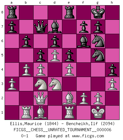 Last move : 0-1 2010 July 8 21:18:37 [Event "FICGS__CHESS__UNRATED_TOURNAMENT__000006"] [Site "FICGS"] [Date "2010.03.12"] [Round "1"] [White "Ellis,Maurice"] [Black "Bencheikh,Ilf"] [Result "0-1"] [WhiteElo "1844"] [BlackElo "2094"] 1.d4 Nf6 2.c4 c5 3.d5 e5 4.Nc3 d6 5.e4 Be7 6.Nge2 h5 7.h3 h4 8.Ng1 Nbd7 9.Nf3 Nf8 10.a3 Ng6 11.Be2 Nh7 12.O-O Ng5 13.Ne1 O-O 14.Nd3 Bf6 15.Qc2 Bd7 16.b4 b6 17.Rb1 Re8 18.Re1 Qc7 0-1 Czech Benoni defense Kingside Castling by player White (move 12) Kingside Castling by player Black (move 13) Player Black won this chess game. Follow this game move after move (download)It is not a move, even the best move that you must seek, but a realizable plan. (Eugene Znosko-Borovsky) Ich bin stolz ein Bulgare zu sein. (Veselin Topalov) El Ajedrez por encima de todo... ¡es una pelea!. (Emanuel Lasker) Roi des jeux et jeu des rois, les échecs portent en eux un sentiment d'infini. Ils donnent à celui qui s'est efforcé d'en approfondir les arcanes l'impression de n'être pas à la mesure de l'homme; en fait, ils constituent un résumé de l'univers, un microcosme, et figurent cette grande échelle qui, dans les plans de la lumière descend jusqu'à la matière, qui des abîmes insondables remonte jusqu'en l'infini de Dieu. (Pyrame) I've never seen so many men wasted so badly. (Blondie in The Good, The Bad and The Ugly)