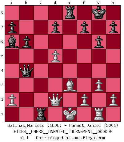 Last move : 0-1 2010 May 26 1:38:18 [Event "FICGS__CHESS__UNRATED_TOURNAMENT__000006"] [Site "FICGS"] [Date "2010.03.12"] [Round "1"] [White "Salinas,Marcelo"] [Black "Parmet,Daniel"] [Result "0-1"] [WhiteElo "1608"] [BlackElo "2001"] 1.e4 e5 2.Qh5 Nc6 3.Bc4 g6 4.Qf3 Nf6 5.Ne2 Bg7 6.Bd5 O-O 7.d3 Nxd5 8.exd5 Nb4 9.Na3 c6 10.Nc3 cxd5 11.Nxd5 e4 12.dxe4 Nxd5 13.exd5 Qa5+ 14.c3 Re8+ 15.Be3 Bxc3+ 16.bxc3 Qxc3+ 17.Ke2 Qb2+ 18.Nc2 Qxc2+ 19.Kf1 b6 20.g3 Bb7 21.Qd1 Qe4 22.Rg1 Ba6+ 23.Ke1 Rac8 24.Rc1 Qb4+ 25.Qd2 Rxc1+ 0-1 Variation Patzer Opening : Patzer Opening Kingside Castling by player Black (move 6) Player Black won this chess game. Follow this game move after move (download)There is only one thing Fischer does in Chess without pleasure: to lose ! (Boris Spassky) Zu meiner Zeit war ein 20 jähriger ein junger Spieler, heute ist er ein Veteran. (Garry Kasparov) Aquel que ve no otra dirección en el juego que la de dar Jaque Mate a su oponente, nunca será un buen jugador de Ajedrez. (Euwe) Le thème de l'attaque double intervient d'une manière ou d'une autre dans l'immense majorité des combinaisons. (Youri Averbakh) Mac users swear by their computers. PC users swear at their computers. (Author unknown)