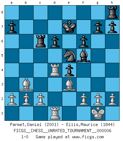 Last move : 1-0 2010 June 11 9:29:35 [Event "FICGS__CHESS__UNRATED_TOURNAMENT__000006"] [Site "FICGS"] [Date "2010.03.12"] [Round "1"] [White "Parmet,Daniel"] [Black "Ellis,Maurice"] [Result "1-0"] [WhiteElo "2001"] [BlackElo "1844"] 1.e4 e5 2.Nf3 d5 3.Nxe5 dxe4 4.Bc4 Nh6 5.d4 Nd7 6.O-O Nxe5 7.dxe5 Qxd1 8.Rxd1 Ng4 9.Nc3 Nxe5 10.Nb5 Bd6 11.Bd5 Bf5 12.Nxd6+ cxd6 13.Bxb7 Rb8 14.Bd5 Rc8 15.Bb3 Ke7 16.Rd4 f6 17.Be3 Rc6 18.Rad1 1-0 Comment by player 1 : Daniel Parmet : sad but true it is. Comment by player 2 : Maurice Ellis : The Elephant Gambit QP counter-gambit (elephant gambit) Kingside Castling by player White (move 6) Player White won this chess game. Follow this game move after move (download)He who fears an isolated Queen's Pawn should give up Chess. (Siegbert Tarrasch) Das Zentrum ist der Balkan des Schachbretts - Kriegshandlungen können in jedem Moment ausbrechen. (Aaron Nimzowitsch) Me siento como si fuera una pieza en una partida de Ajedrez, cuando mi oponente me indica: esa pieza no puede ser movida. (Soren Kierkegaard) Le moment que je préfère le plus dans une rencontre, c'est celui où je sens que la personnalité de l'adversaire se brise. (Robert Fischer) Watch your thoughts; they become words. Watch your words; they become actions. Watch your actions; they become habits. Watch your habits; they become character. Watch your character; it becomes your destiny. (Frank Outlaw)