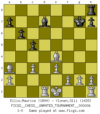 Last move : 1-0 2010 March 24 21:8:56 [Event "FICGS__CHESS__UNRATED_TOURNAMENT__000006"] [Site "FICGS"] [Date "2010.03.12"] [Round "1"] [White "Ellis,Maurice"] [Black "Ylonen,Olli"] [Result "1-0"] [WhiteElo "1844"] [BlackElo "1433"] 1.d4 d5 2.c4 e6 3.Nc3 dxc4 4.e3 Bb4 5.Bxc4 Nc6 6.Nf3 e5 7.Qb3 e4 8.Bxf7+ Kf8 9.Ne5 Nxe5 10.dxe5 Bxc3+ 11.bxc3 Qe7 12.Ba3 c5 13.Bd5 b6 14.Bxa8 Be6 15.Qc2 Qe8 16.Qxe4 Bd7 17.Rd1 Nf6 18.exf6 Qxe4 19.fxg7+ Kxg7 20.Bxe4 1-0 QGD : 3.Nc3 Player White won this chess game. Follow this game move after move (download)Castle early and often. (Rob Sillars) Ivan Sokolov treibt mich als Beifahrer an mit go Loeky go - . (Loek van Wely) Un entendimiento minucioso de las típicas continuaciones de mate hacen de las mas complicadas combinaciones de sacrificio que conducen hacia ellas no solo no dificiles, sino casi un asunto de rutina. (Siegbert Tarrasch) Un journaliste : 'Vous préférez avoir une dame de plus sur l'échiquier ou au lit ?' Boris Spassky : 'Ca dépend de la position.' If things go wrong, don't go with them. (Roger Babson)