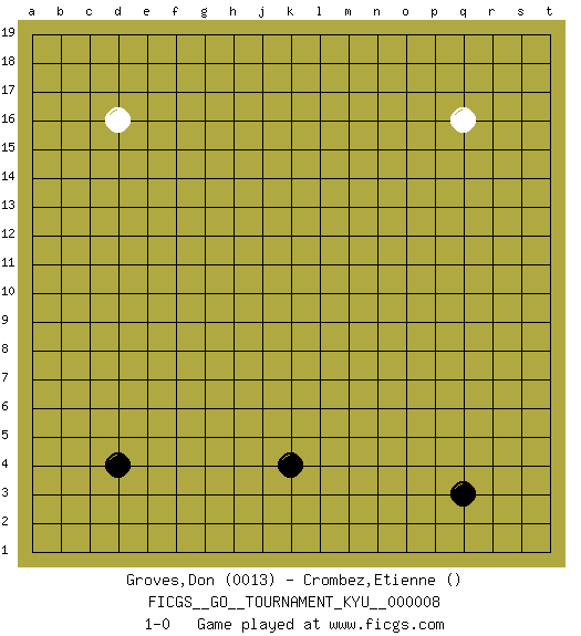 Last move : 1-0 2006 November 22 8:47:18 [Event "FICGS__GO__TOURNAMENT_KYU__000008"] [Site "FICGS"] [Date "2006.10.19"] [Round "1"] [Black "Groves,Don"] [White "Crombez,Etienne"] [Result "1-0"] [Rating 1 "0013"] 1.d4 q16 2.q3 d16 3.k4 1-0 This go game has been lost on time (started : 2006.10.19 17:19:28) Here are the names of the openings (joseki) played in the four corners : Player Black won this Go (weiqi, baduk) game. Follow this game move after move (download)Proverbs do not apply to White. (Tero Sand) Statistics can be made to prove anything - even the truth. (Author unknown)