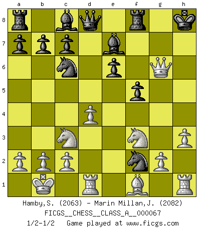 Last move : 1/2-1/2 2010 July 4 15:46:53 [Event "FICGS__CHESS__CLASS_A__000067"] [Site "FICGS"] [Date "2010.03.13"] [Round "1"] [White "Hamby,Stephen"] [Black "Marin Millan,Jose Antonio"] [Result "1/2-1/2"] [WhiteElo "2063"] [BlackElo "2082"] 1.d4 d5 2.e4 dxe4 3.Nc3 Nf6 4.f3 exf3 5.Nxf3 e6 6.Bg5 Be7 7.Qd2 O-O 8.O-O-O Nc6 9.Kb1 h6 10.Bxh6 gxh6 11.Qxh6 Ng4 12.Qh5 f5 13.Qg6+ Kh8 14.h3 Nf2 1/2-1/2 Blackmar gambit Kingside Castling by player Black (move 7) Queenside Castling by player White (move 8) This chess game ended in a draw. Follow this game move after move (download)The winner of the game is the player who makes the next-to-last mistake. (Savielly Tartakover) Verschiedene, sehr schätzbare und im Laufe des Lebens nützliche Eigenschaften des Geistes können durch das Schachspiel erworben und gekräftigt werden, so dass sie zu Gewohnheiten werden, die uns nie im Stich lassen. (Benjamin Franklin) Algunos sacrificios son sólidos, los demás son míos. (Mikhail Tal) On n'a jamais que l'âge auquel on a commence à jouer aux échecs car après on cesse de vieillir. (Capablanca) Knowledge rests not upon truth alone, but upon error also. (Carl G. Jung)