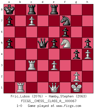 Last move : 1-0 2010 November 11 8:9:26 [Event "FICGS__CHESS__CLASS_A__000067"] [Site "FICGS"] [Date "2010.03.13"] [Round "1"] [White "Fric,Lubos"] [Black "Hamby,Stephen"] [Result "1-0"] [WhiteElo "2076"] [BlackElo "2063"] 1.e4 d5 2.exd5 Nf6 3.Nf3 Nxd5 4.d4 Bg4 5.h3 Bxf3 6.Qxf3 e6 7.Bb5+ c6 8.Be2 c5 9.Bb5+ Nd7 10.c4 Nc7 11.Bxd7+ Qxd7 12.dxc5 Na6 13.Nc3 Bxc5 14.Bf4 O-O-O 15.O-O Qd3 16.Be3 Bxe3 17.fxe3 f6 18.Nb5 Kb8 19.Qg3+ Ka8 20.b3 Qg6 21.Qf3 Qf7 22.Rad1 Qe7 23.Qe4 h6 24.Qg4 Kb8 25.Nd4 Rhe8 26.a3 Nc5 27.b4 Nd7 28.Qg3+ Ka8 29.c5 Ne5 30.Rc1 Rc8 31.Rc3 g5 32.b5 h5 33.c6 b6 34.a4 g4 35.a5 bxa5 36.h4 Nf7 37.Ra1 e5 38.Nf5 Qb4 39.Qe1 Qxb5 40.Rb1 Qd5 41.c7 1-0 Scandinavian defense Queenside Castling by player Black (move 14) Kingside Castling by player White (move 15) Player White won this chess game. Follow this game move after move (download)He who takes the Queen's Knight's Pawn will sleep in the streets. (Anonymous) Herr Iljumschinow ist ein etwas merkwürdiger Geschäftsmann: Er arbeitet zusammen mit Leuten wie Muammar al-Gaddafi; früher ist das Saddam Hussein gewesen. (Joel Lautier) Dios mío, Bobby Fischer juega tan simple. (Alexei Suetin) Je ne crois pas en la psychologie, je crois aux bons coups. (Robert Fischer) We need strong personalities and only one world champion to attract sponsors. (Anatoly Karpov)