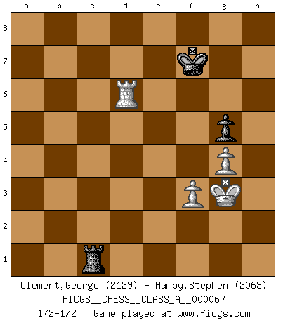 Last move : 1/2-1/2 2011 January 6 22:11:41 [Event "FICGS__CHESS__CLASS_A__000067"] [Site "FICGS"] [Date "2010.03.13"] [Round "1"] [White "Clement,George"] [Black "Hamby,Stephen"] [Result "1/2-1/2"] [WhiteElo "2129"] [BlackElo "2063"] 1.e4 Nf6 2.e5 Nd5 3.d4 d6 4.Nf3 Bg4 5.Be2 e6 6.c4 Nb6 7.O-O Be7 8.Nc3 O-O 9.Be3 N8d7 10.exd6 cxd6 11.b3 d5 12.c5 Nc8 13.h3 Bxf3 14.Bxf3 Bg5 15.b4 Rb8 16.Bd2 Qf6 17.Ne2 Ne7 18.b5 Rfc8 19.a4 Nf5 20.a5 Bxd2 21.Qxd2 a6 22.Rab1 Qd8 23.Nf4 axb5 24.Rxb5 Ne7 25.Rfb1 Nc6 26.Bg4 Nf8 27.Rxb7 Rxb7 28.Rxb7 Nxa5 29.Ra7 Nc6 30.Ra6 Qc7 31.g3 Qb7 32.Rb6 Qa8 33.Qb2 Rd8 34.Kg2 Qa4 35.Ne2 Nd7 36.Rb7 Nf6 37.Bf3 Kf8 38.Rb3 Rc8 39.Ra3 Qb4 40.Qa1 Qb8 41.Ra6 Qb7 42.Qa4 Qb4 43.Qa2 Qb7 44.Rb6 Qc7 45.Qb2 Qe7 46.Nf4 Nxd4 47.Qxd4 e5 48.Nxd5 exd4 49.Nxe7 Kxe7 50.c6 Ke6 51.Rb4 Nd5 52.Rxd4 Ne7 53.Re4+ Kd6 54.Rf4 Ke6 55.Rh4 h6 56.Re4+ Kd6 57.Rf4 f6 58.Rd4+ Ke6 59.Rd7 g6 60.g4 g5 61.Be4 Nxc6 62.Bxc6 Rxc6 63.Rh7 Rc5 64.Rxh6 Kf7 65.Kg3 f5 66.Rd6 fxg4 67.hxg4 Rc1 68.f3 1/2-1/2 Alekhine's defense : Modern variation, 4...Bg4 Kingside Castling by player White (move 7) Kingside Castling by player Black (move 8) 10 pieces endgame at move 62 : White KRPPP , Black KRPPP WHITE : King + 1 Rook 3 Pawns BLACK : King + 1 Rook 3 Pawns 9 pieces endgame at move 64 : White KRPPP , Black KRPP WHITE : King + 1 Rook 3 Pawns BLACK : King + 1 Rook 2 Pawns 8 pieces endgame at move 66 : White KRPP , Black KRPP WHITE : King + 1 Rook 2 Pawns BLACK : King + 1 Rook 2 Pawns 7 pieces endgame at move 67 : White KRPP , Black KRP WHITE : King + 1 Rook 2 Pawns BLACK : King + 1 Rook 1 Pawn This chess game ended in a draw. Follow this game move after move (download)Who is your opponent tonight, tonight I am playing against the Black pieces. (Akiba Rubinstein) Jeder weiß, dass Gasprom Putins persönliches Machtinstrument ist. Die Firma wird vom Kreml aus geleitet und wird schon deshalb nie transparent sein. (Garry Kasparov) En partidas rápidas, el Caballo es mas poderoso que el Alfil. (Vlastimil Hort) On croit qu'il y a plus de mauvais joueurs que de bons joueurs, c'est faux : Il y a autant de joueurs qui gagnent que de joueurs qui perdent. (Philippe Geluck) Philosophers use a language that is already deformed as though by shoes that are too tight. (Ludwig Wittgenstein)