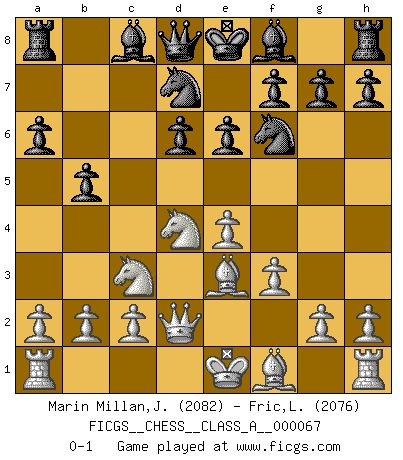 Last move : 0-1 2010 May 1 19:45:39 [Event "FICGS__CHESS__CLASS_A__000067"] [Site "FICGS"] [Date "2010.03.13"] [Round "1"] [White "Marin Millan,Jose Antonio"] [Black "Fric,Lubos"] [Result "0-1"] [WhiteElo "2082"] [BlackElo "2076"] 1.e4 c5 2.Nf3 d6 3.d4 cxd4 4.Nxd4 Nf6 5.Nc3 a6 6.Be3 e6 7.f3 b5 8.Qd2 Nbd7 0-1 This chess game has been lost on time (started : 2010.03.13 20:34:36) Sicilian : Najdorf, Byrne (English) attack Player Black won this chess game. Follow this game move after move (download)When the Chess game is over, the Pawn and the King go back to the same box. (Irish saying) Frage: Wie viele Autos haben Sie schon zerstört? - Antwort: Nur zwei. (Loek van Wely) Un entendimiento minucioso de las típicas continuaciones de mate hacen de las mas complicadas combinaciones de sacrificio que conducen hacia ellas no solo no dificiles, sino casi un asunto de rutina. (Siegbert Tarrasch) Soyez une menace à chaque fois que vous vous asseyez pour jouer. (Ken Smith) They say in chess you've got to kill the queen, and then you mate it... Oh I, do you ? (Red Hot Chili Peppers, Fortune faded)