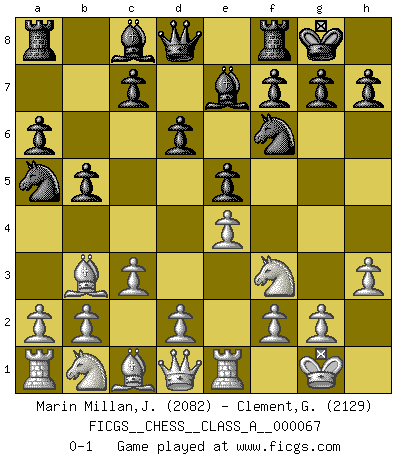 Last move : 0-1 2010 April 30 7:38:30 [Event "FICGS__CHESS__CLASS_A__000067"] [Site "FICGS"] [Date "2010.03.13"] [Round "1"] [White "Marin Millan,Jose Antonio"] [Black "Clement,George"] [Result "0-1"] [WhiteElo "2082"] [BlackElo "2129"] 1.e4 e5 2.Nf3 Nc6 3.Bb5 a6 4.Ba4 Nf6 5.O-O Be7 6.Re1 b5 7.Bb3 d6 8.c3 O-O 9.h3 Na5 0-1 This chess game has been lost on time (started : 2010.03.13 20:34:36) Ruy Lopez : Closed Kingside Castling by player White (move 5) Kingside Castling by player Black (move 8) Player Black won this chess game. Follow this game move after move (download)There just isn't enough televised Chess. (David Letterman) Ein Schachgenie ist jemand der verdammt gut Schach spielt. (Jonathan Levitt) ¿Se han dado cuenta de que Fischer casi nunca ha tenido piezas malas? El las intercambia y las piezas malas se quedan con sus oponenets. (Yuri Balashov) Le plus grand jeu de l'esprit jamais inventé, plus vous l'apprenez, plus vous y prenez du plaisir. (Garry Kasparov) Life is like internet, nothing interesting, but noone want to leave it. (Ilmars Cirulis)