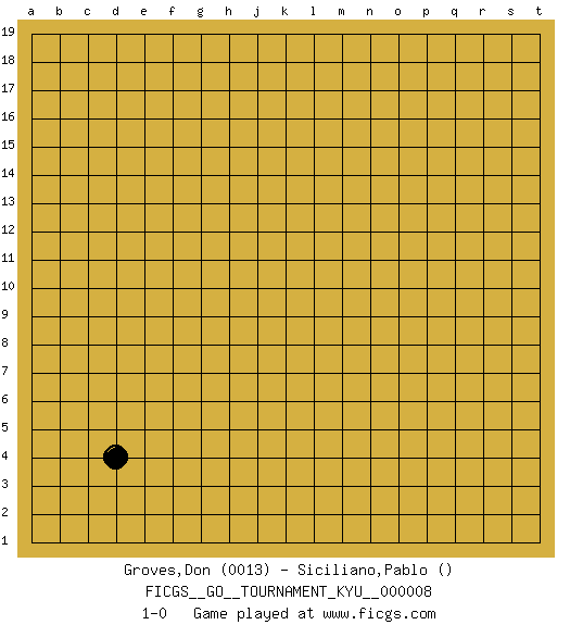 Last move : 1-0 2006 November 19 8:17:39 [Event "FICGS__GO__TOURNAMENT_KYU__000008"] [Site "FICGS"] [Date "2006.10.19"] [Round "1"] [Black "Groves,Don"] [White "Siciliano,Pablo"] [Result "1-0"] [Rating 1 "0013"] 1.d4 1-0 This go game has been lost on time (started : 2006.10.19 17:19:28) Here are the names of the openings (joseki) played in the four corners : Corner d4 : d4 1-0 Hoshi (Hwajeom, Seongjeom, Xingwei`) 4-4 Point. The star or hoshi (4-4) point, emphasizing influence at the potential expense of territory. Player Black won this Go (weiqi, baduk) game. Follow this game move after move (download)The comb formation is alive. (Anonymous) A married woman is like a fish riding a bicycle. (Rodolfo d'Ettorre)