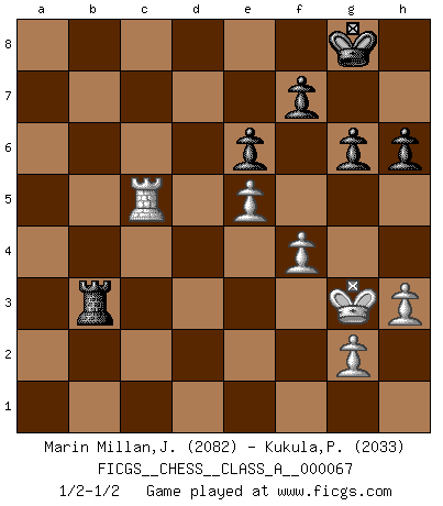 Last move : 1/2-1/2 2010 October 25 7:17:34 [Event "FICGS__CHESS__CLASS_A__000067"] [Site "FICGS"] [Date "2010.03.13"] [Round "1"] [White "Marin Millan,Jose Antonio"] [Black "Kukula,Pawel"] [Result "1/2-1/2"] [WhiteElo "2082"] [BlackElo "2033"] 1.e4 c5 2.Nf3 e6 3.d4 cxd4 4.Nxd4 a6 5.Nc3 Qc7 6.Be2 Nf6 7.O-O Nc6 8.Be3 Bb4 9.Nxc6 dxc6 10.Qd3 O-O 11.Rad1 Be7 12.Na4 c5 13.c4 Bd7 14.Nc3 b5 15.f4 bxc4 16.Qc2 Qb7 17.Bxc4 Bb5 18.b3 Rfd8 19.h3 h6 20.Rxd8+ Rxd8 21.Rc1 Bc6 22.Bd3 a5 23.e5 Nd5 24.Nxd5 Bxd5 25.Bc4 Qc6 26.Kh2 Be4 27.Qe2 Rb8 28.Rc3 Bf8 29.Bd3 Bxd3 30.Qxd3 a4 31.Qc4 axb3 32.axb3 Qb6 33.Kg3 g6 34.Bxc5 Bxc5 35.Qxc5 Qxc5 36.Rxc5 Rxb3+ 1/2-1/2 Sicilian : Kan, 5.Nc3 Kingside Castling by player White (move 7) Kingside Castling by player Black (move 10) This chess game ended in a draw. Follow this game move after move (download)Chess is a part of culture and if a culture is declining then Chess too will decline. (Mikhail Botvinnik) Es gibt Leute, die glauben, alles wäre vernünftig, was man mit einem ernsthaften Gesicht tut. (Georg Christoph Lichtenberg) El sobresalir en el Ajedrez es un signo de una mente intrigante. (Sir Arthur Conan Doyle) Les échecs sont utiles à l'exercice de la faculté de penser et à celle de l'imagination. Car nous devons posséder une méthode élaborée pour atteindre des buts partout où nous devons conduire notre raison. (Leibnitz) Always be a first-rate version of yourself, instead of a second-rate version of somebody else. (Judy Garland)