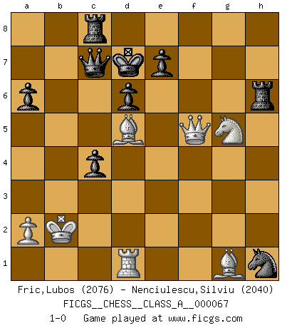 Last move : 1-0 2010 June 28 17:59:24 [Event "FICGS__CHESS__CLASS_A__000067"] [Site "FICGS"] [Date "2010.03.13"] [Round "1"] [White "Fric,Lubos"] [Black "Nenciulescu,Silviu"] [Result "1-0"] [WhiteElo "2076"] [BlackElo "2040"] 1.e4 c5 2.Nf3 d6 3.d4 cxd4 4.Nxd4 Nf6 5.Nc3 g6 6.Be3 Bg7 7.f3 Nbd7 8.Qd2 a6 9.g4 Ne5 10.O-O-O b5 11.g5 Nh5 12.f4 Ng4 13.Bg1 h6 14.h3 Ng3 15.hxg4 Nxh1 16.f5 hxg5 17.Bg2 Bd7 18.fxg6 Bxg4 19.e5 Rc8 20.gxf7+ Kxf7 21.e6+ Bxe6 22.Nxe6 Kxe6 23.Ne4 Kf7 24.Nxg5+ Ke8 25.Qd5 Bxb2+ 26.Kxb2 Qc7 27.Qf7+ Kd7 28.Qf5+ Ke8 29.Bd5 Rh6 30.Qf7+ Kd7 31.c4 bxc4 32.Qf5+ 1-0 Sicilian : Dragon, Yugoslav attack Queenside Castling by player White (move 10) Player White won this chess game. Follow this game move after move (download)Let the perfectionist play postal. (Yasser Seirawan) Es gibt zwei Arten von Opfern: Korrekte und meine. (Mikhail Nekhemyevich Tal) Todos los jugadores de Ajedrez deberían tener un pasatiempo. (Savielly Tartakower) On est toujours la mazette de quelqu'un d'autre. (Anonyme) Always two there are. No more no less. A master, and an apprentice. (Master Yoda in Star Wars ep.1)