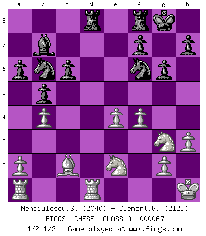 Last move : 1/2-1/2 2010 May 15 15:41:46 [Event "FICGS__CHESS__CLASS_A__000067"] [Site "FICGS"] [Date "2010.03.13"] [Round "1"] [White "Nenciulescu,Silviu"] [Black "Clement,George"] [Result "1/2-1/2"] [WhiteElo "2040"] [BlackElo "2129"] 1.d4 Nf6 2.c4 e6 3.Nf3 d5 4.Nc3 c6 5.e3 Nbd7 6.Qc2 Bd6 7.Be2 O-O 8.O-O dxc4 9.Bxc4 b5 10.Bd3 Bb7 11.e4 e5 12.Rd1 Qc7 13.h3 a6 14.Be3 exd4 15.Nxd4 Rad8 16.Nf5 Bh2+ 17.Kh1 Bf4 18.Bxf4 Qxf4 19.f3 g6 20.Ne2 Qe5 21.f4 Qc5 22.Nfg3 Qxc2 23.Bxc2 Nb6 24.b4 1/2-1/2 Queen's pawn game Kingside Castling by player Black (move 7) Kingside Castling by player White (move 8) This chess game ended in a draw. Follow this game move after move (download)Kasparov : J'adoube , Ivanchuk : S'il vous plaît ! (Garry Kasparov & Vassily Ivanchuk, Linares 1997) Ich würde die 30 stärksten Spieler der USA im Simultanspiel besiegen. (José Raúl Capablanca) Los libros de Ajedrez deben de usarse igual como usamos los anteojos: para mejorar la vista, aunque algunos jugadores los quieren usar como si ellos les otorgaran la vision. (José Raúl Capablanca) Ce qui est bien, c'est d'avoir tout un tas de pièces en prise : l'adversaire ne peut en prendre qu'une à la fois. Cité par Thierry Audin. Computers have lots of memory but no imagination. (Anonymous)