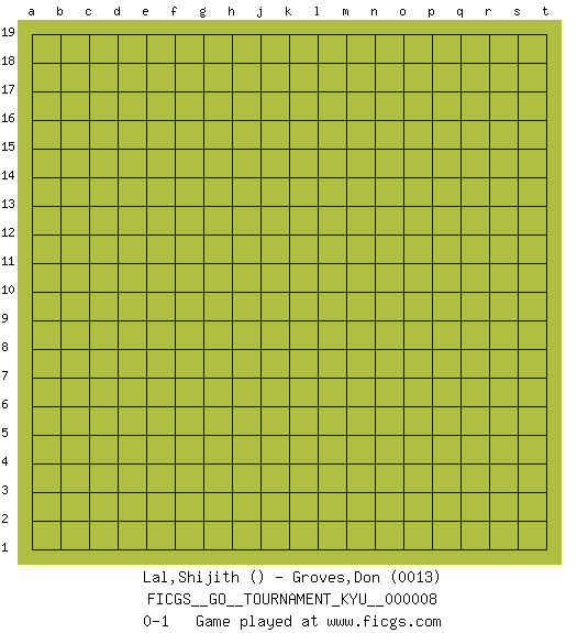 Last move : 0-1 2006 October 19 17:42:47 [Event "FICGS__GO__TOURNAMENT_KYU__000008"] [Site "FICGS"] [Date "2006.10.19"] [Round "1"] [Black "Lal,Shijith"] [White "Groves,Don"] [Result "0-1"] [Rating 2 "0013"] 0-1 Here are the names of the openings (joseki) played in the four corners : Player White won this Go (weiqi, baduk) game. Follow this game move after move (download)A meijin needs no joseki. (Anonymous) Perception is reality. (Immanuel Kant)
