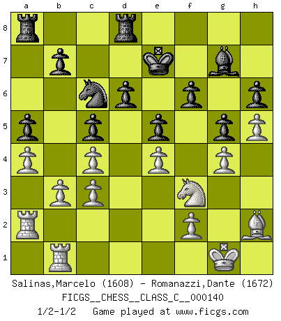 Last move : 1/2-1/2 2010 August 3 1:22:9 [Event "FICGS__CHESS__CLASS_C__000140"] [Site "FICGS"] [Date "2010.03.13"] [Round "1"] [White "Salinas,Marcelo"] [Black "Romanazzi,Dante"] [Result "1/2-1/2"] [WhiteElo "1608"] [BlackElo "1672"] 1.e4 e5 2.Qf3 d6 3.Bc4 Qf6 4.d3 c6 5.Bg5 Qxf3 6.Nxf3 h6 7.Bh4 Ne7 8.O-O g5 9.Bg3 a5 10.a4 Be6 11.Nc3 Bxc4 12.dxc4 Bg7 13.Rad1 Nc8 14.h4 f6 15.h5 Ke7 16.b3 Na6 17.Rd2 Nc5 18.Re2 Nb6 19.Rd1 Na6 20.Red2 Rhd8 21.Na2 Nb4 22.c3 Nxa2 23.Rxa2 c5 24.Bh2 Nd7 25.g4 Nb8 26.Rb1 Nc6 1/2-1/2 Variation Napoleon's Opening : Napoleon's Opening Kingside Castling by player White (move 8) This chess game ended in a draw. Follow this game move after move (download)When you don't know what to do, wait for your opponent to get an idea - it's sure to be wrong. (Tarrasch) Um dein Spiel zu verbessern musst du zuallererst das Endspiel studieren, denn diese kann unabhängig studiert werden. Die Eröffnung und das Mittelspiel müssen immer in Bezug gesetzt werden zum Endspiel. (José Raúl Capablanca) El Ajedrez es imaginación. (David Bronstein) Si rien de grave n'est détecté lors de l'analyse d'une position, on joue alors le coup. Seconde règle de Blumenfeld. Have no fear of perfection - you'll never reach it. (Salvador Dali)