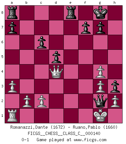 Last move : 0-1 2010 June 10 10:8:59 [Event "FICGS__CHESS__CLASS_C__000140"] [Site "FICGS"] [Date "2010.03.13"] [Round "1"] [White "Romanazzi,Dante"] [Black "Ruano,Pablo"] [Result "0-1"] [WhiteElo "1672"] [BlackElo "1660"] 1.d4 Nf6 2.Nc3 d5 3.e3 Nc6 4.Bb5 e6 5.Bxc6+ bxc6 6.Nge2 Bd6 7.O-O O-O 8.a3 e5 9.Ng3 Re8 10.f3 h5 11.Bd2 h4 12.Nh1 h3 13.g3 exd4 14.exd4 c5 15.Bg5 c6 16.Ne2 Ba6 17.Nf2 Bxe2 18.Qd2 Bxf1 19.Kxf1 cxd4 20.Ng4 Be7 21.Qxd4 Nxg4 22.Bxe7 Qxe7 23.fxg4 Qe2+ 24.Kg1 Qg2+ 0-1 Queen's pawn game Kingside Castling by player White (move 7) Kingside Castling by player Black (move 7) Player Black won this chess game. Follow this game move after move (download)My opponents make good moves too. Sometimes I don't take these things into consideration. (Bobby Fischer) Schach verlangt totale Konzentration. (Robert James Fischer) Tu sabes que vas a perder. Aún cuando tenía la ventaja, yo sabía que iba a perder. - al estar jugando con Fischer (Andrew Soltis) Le jeu d'échecs fait naître et fortifie en nous plusieurs qualités précieuses dans le cours de l'existence, telles que la prévoyance, la circonspection, la prudence, et la persévérance. (Benjamin Franklin - 1783, la morale des échecs) The good fighters of old first put themselves beyond the possibility of defeat, and then waited for an opportunity of defeating the enemy. (Sun Tzu)