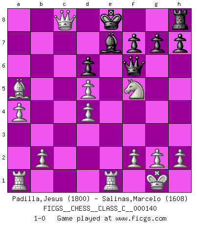 Last move : 1-0 2010 August 11 22:35:15 [Event "FICGS__CHESS__CLASS_C__000140"] [Site "FICGS"] [Date "2010.03.13"] [Round "1"] [White "Padilla,Jesus"] [Black "Salinas,Marcelo"] [Result "1-0"] [WhiteElo "1800"] [BlackElo "1608"] 1.e4 e5 2.Nf3 Nc6 3.Bb5 Nd4 4.Nxd4 exd4 5.O-O Qg5 6.a4 c6 7.Bc4 a5 8.d3 Qg6 9.Nd2 d6 10.Nb3 Bh3 11.Qf3 Be6 12.Bxe6 Qxe6 13.Bd2 Qf6 14.Qe2 b6 15.c3 c5 16.cxd4 Rc8 17.Bc3 cxd4 18.Nxd4 Rc5 19.Nf5 Qg6 20.d4 Rc7 21.Qb5+ Kd8 22.Qxb6 Ne7 23.Bxa5 Nd5 24.exd5 Qf6 25.Qxc7+ Ke8 26.Rfe1+ Be7 27.Qc8+ 1-0 This chess game has been lost on time (started : 2010.03.13 21:15:13) Ruy Lopez : Bird's defense Kingside Castling by player White (move 5) Player White won this chess game. Follow this game move after move (download)The most powerful weapon in Chess is to have the next move. (David Bronstein) Ich organisiere ein großes Turnier, was mich etwa 120000 Dollar kostet. Ich denke, das ist das erste Mal in der Schachgeschichte, daß ein Schachgroßmeister auch als Mäzen auftritt. (Miguel Najdorf) Una compensación adecuada por un sacrificio es tener una combinación sólida que conduce a una posición ganadora; una compensación adecuada por una metida de pata es dejar a tu oponente arrebatar una derrota de las fauces de la victoria. (Bruce A. Moon) Même si vous avez un bon coup à faire, regardez toujours s'il n'y en a pas un qui lui soit préférable. (Pedro Damiano) If only people were all showed a certain minimum level of niceness; if only people didn't retract verbal draw offers (without draw box ticked) on ficgs; if only people didn't kill; if only people didn't run concentration / extermination camps, if only people didn't drop nuclear bombs on Hiroshima and Nagasaki, and so on - it would be a much more beautiful world. But sadly, things are not so... (Normajean Yates)