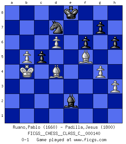 Last move : 0-1 2011 March 7 11:37:37 [Event "FICGS__CHESS__CLASS_C__000140"] [Site "FICGS"] [Date "2010.03.13"] [Round "1"] [White "Ruano,Pablo"] [Black "Padilla,Jesus"] [Result "0-1"] [WhiteElo "1660"] [BlackElo "1800"] 1.e4 c5 2.Nf3 d6 3.d4 cxd4 4.Nxd4 Nf6 5.Nc3 e5 6.Bb5+ Bd7 7.Nf5 Nc6 8.Nxd6+ Bxd6 9.Qxd6 Qb8 10.Qxb8+ Rxb8 11.Be3 a6 12.Bd3 Be6 13.O-O-O O-O 14.f3 Rbc8 15.a3 h6 16.Bb6 Nd7 17.Bf2 Nf6 18.Rd2 Na5 19.Bg3 Nc6 20.Rhd1 Rfd8 21.Kb1 Rd6 22.Be2 Rxd2 23.Rxd2 Nd7 24.Bf2 Ne7 25.Nd5 Nxd5 26.exd5 Bf5 27.g4 Bg6 28.b4 e4 29.d6 Re8 30.fxe4 Bxe4 31.a4 f6 32.Ka2 Kf7 33.Bc4+ Kf8 34.Bd4 Bf3 35.h3 Re1 36.b5 axb5 37.axb5 Rh1 38.Be6 Ke8 39.Rd3 Rd1 40.Rxd1 Bxd1 41.c4 Be2 42.Kb3 b6 43.Kb4 Nf8 44.Bf5 Nd7 45.c5 bxc5+ 0-1 This chess game has been lost on time (started : 2010.03.13 21:15:13) Sicilian : Venice attack Queenside Castling by player White (move 13) Kingside Castling by player Black (move 13) Player Black won this chess game. Follow this game move after move (download)The isolated Pawn casts gloom over the entire chessboard. (Aaron Nimzovich) Spielt Blackmar-Diemer-Gambit, und das Matt kommt von selbst! (Emil Joseph Diemer) El jugador blanco perdió porque fallo en recordar la coreccta continuación y tuvo que pensar por sí mismo las movidas. (Siegbert Tarrasch) C'est une question de caractère, Beaucoup de gens perdent leur motivation très vite. D'autres, ils sont rares, peuvent la conserver très longtemps. J'aime les échecs, encore aujourd'hui je suis heureux d'analyser des parties. J'aime toujours gagner, je déteste encore perdre. Bien jouer est important pour mon intégrité intellectuelle et morale. Et puis les échecs vivent en ce moment une période historique grâce à Internet. Ils se développent dans les systèmes éducatifs à travers le monde. Ils sortent de leur ghetto, et c'est mon rôle de mener à bien cette révolution. (Gary Kasparov) At work, the authority of a person is inversely proportional to the number of pens that person is carrying. (Dan Rotaru)