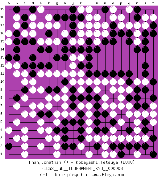 Last move : 0-1 2007 August 20 16:37:45 [Event "FICGS__GO__TOURNAMENT_KYU__000008"] [Site "FICGS"] [Date "2006.10.19"] [Round "1"] [Black "Phan,Jonathan"] [White "Kobayashi,Tetsuya"] [Result "0-1"] [Rating 2 "2000"] 1.q4 d16 2.d4 r16 3.s12 c6 4.b4 f3 5.r14 c3 6.d3 c4 7.c5 b5 8.d5 b3 9.b14 b7 10.d8 d6 11.b8 e5 12.f2 g3 13.d2 g2 14.e6 e4 15.f1 c2 16.s16 s17 17.s15 q17 18.q16 p17 19.q15 c16 20.b16 b17 21.c15 a16 22.b15 c11 23.d13 e11 24.d15 e15 25.e14 f15 26.f14 g15 27.e12 f11 28.f12 g11 29.h13 k16 30.j16 j15 31.j17 k17 32.k18 l18 33.g18 e17 34.h15 h16 35.h14 k15 36.h18 g17 37.e18 d18 38.l17 k19 39.j18 m18 40.m16 n16 41.m14 m15 42.l15 l16 43.n15 m17 44.k14 j11 45.k12 o3 46.o2 p3 47.p2 q3 48.l2 r4 49.s4 r5 50.s2 n2 51.q2 r3 52.r2 s3 53.t3 m3 54.m2 o1 55.p1 n1 56.j2 l5 57.m4 l3 58.m1 n3 59.s5 s6 60.s7 t5 61.q10 l10 62.l11 m10 63.m11 n10 64.n11 o10 65.o11 k2 66.l8 p8 67.p9 o9 68.o8 n8 69.o7 p7 70.q8 q7 71.r7 r6 72.r9 k11 73.m6 l6 74.m7 l7 75.m8 k9 76.k8 h8 77.j7 h7 78.h10 h11 79.g13 t2 80.t1 r1 81.k4 l4 82.m5 j6 83.d11 d10 84.d12 c10 85.c12 b12 86.b13 b11 87.f6 g5 88.g7 g8 89.g9 f8 90.f9 e9 91.e8 g6 92.c7 d7 93.o16 n17 94.o17 o18 95.r18 r17 96.p16 p10 97.p11 j12 98.j14 l17 99.p19 p18 100.t17 t18 101.t16 s18 102.h3 t7 103.t8 t6 104.s9 k13 105.l12 j13 106.l13 a12 107.a13 a15 108.j9 c8 109.j8 h9 110.o5 n7 111.n6 o6 112.h5 f7 113.j5 m15 114.l14 m16 115.o15 q9 116.r8 p9 117.n19 o19 118.r19 q19 119.j19 l19 120.h2 r10 121.q11 s10 122.s11 r15 123.s14 pass 124.pass pass 125.k3 l1 126.k6 h6 127.k5 k7 128.g4 f4 129.h4 e2 130.d1 e7 131.e1 g1 132.e3 c1 133.c9 d9 134.p6 o7 135.p4 o4 136.n4 j10 137.q5 q6 138.t10 p5 139.c18 f18 140.c17 b18 141.d19 e19 142.f16 f17 143.b19 d17 144.a2 a4 145.q4 e2 146.l9 k10 147.m2 m9 0-1 Here are the names of the openings (joseki) played in the four corners : Corner q16 : r16 s12 Komoku (Somok, Xiao~mu`) 3-4 Point. The komoku (3-4) point is the traditional corner enclosure move.. Corner d4 : d4 c6 Hoshi (Hwajeom, Seongjeom, Xingwei`) 4-4 Point. The star or hoshi (4-4) point, emphasizing influence at the potential expense of territory. Ikken Kakari (Hankan Keolch'im, Yi Gua`jiao~, 1-Space Low Approach). White 2 is the standard approach move to the 4-4. Corner d16 : d16 b14 Hoshi (Hwajeom, Seongjeom, Xingwei`) 4-4 Point. The star or hoshi (4-4) point, emphasizing influence at the potential expense of territory. Corner q4 : q4 o3 Hoshi (Hwajeom, Seongjeom, Xingwei`) 4-4 Point. The star or hoshi (4-4) point, emphasizing influence at the potential expense of territory. Ikken Kakari (Hankan Keolch'im, Yi Gua`jiao~, 1-Space Low Approach). White 2 is the standard approach move to the 4-4. Player White won this Go (weiqi, baduk) game. Follow this game move after move (download)Learning josekis by heart is useless if you don't try departing from them. (Pierre Audouard) You must do what you feel is right... of course. (Obi-Wan Kenobi in Star Wars ep.4)