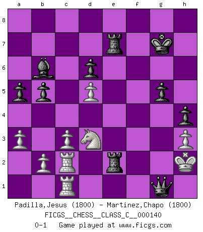 Last move : 0-1 2010 May 9 23:51:29 [Event "FICGS__CHESS__CLASS_C__000140"] [Site "FICGS"] [Date "2010.03.13"] [Round "1"] [White "Padilla,Jesus"] [Black "Martinez,Chapo"] [Result "0-1"] [WhiteElo "1800"] [BlackElo "1800"] 1.e4 c5 2.Nf3 d6 3.d4 cxd4 4.Nxd4 Nf6 5.Nc3 a6 6.Be2 e5 7.Nb3 Be7 8.Bg5 O-O 9.O-O Be6 10.Qd3 Nbd7 11.Rad1 Rc8 12.h3 b5 13.a3 h6 14.Be3 Qc7 15.Rfe1 Nb6 16.Nd2 Rfd8 17.Bxb6 Qxb6 18.Nd5 Nxd5 19.exd5 Bd7 20.Bg4 g6 21.Bxd7 Rxd7 22.c3 Kg7 23.Qe3 Qxe3 24.Rxe3 h5 25.Nf3 h4 26.Re2 f5 27.Ne1 a5 28.Nd3 Rb7 29.Ra1 Bg5 30.f3 Bd8 31.Kh2 Rc4 32.Rf1 Bb6 33.Rfe1 g5 34.Rh1 e4 35.fxe4 Rxe4 36.Rc2 Rbe7 37.Rf1 f4 38.Rb1 Re2 39.Rbc1 f3 40.Kh1 fxg2+ 41.Kh2 g1Q+ 0-1 Sicilian : Najdorf, Opovcensky variation Kingside Castling by player Black (move 8) Kingside Castling by player White (move 9) Promotion Queen by player Black (move 41) Player Black won this chess game. Follow this game move after move (download)Chess makes man wiser and clear-sighted. (Vladimir Putin) Ich hatte meine größten Erfolge, als ich 47 Jahre alt war. Kasparow war noch nicht mal 42 und hat das Schach schon im Stich gelassen. (Viktor Kortschnoi) Cuando no sepas que mover, espera por una idea que se le venga a la la cabeza de tu oponente. Tenlo por seguro de que esa idea estará incorrecta. (Siegbert Tarrasch) Si je n'étais pas joueur d'échecs, je serais le meilleur dans quelque chose d'autre. (Anatoli Karpov) I'm extremely disappointed. I send you out for exciting, new designer drugs, you come back with tomato sauce. (Gregory House, House M.D.)