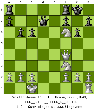 Last move : 1-0 2010 May 18 9:10:18 [Event "FICGS__CHESS__CLASS_C__000140"] [Site "FICGS"] [Date "2010.03.13"] [Round "1"] [White "Padilla,Jesus"] [Black "Oraha,Zaki"] [Result "1-0"] [WhiteElo "1800"] [BlackElo "1643"] 1.e4 e6 2.d4 d5 3.Nc3 dxe4 4.Nxe4 Nf6 5.Bg5 Be7 6.Bxf6 Bxf6 7.Nf3 O-O 8.Qd2 b6 9.O-O-O Bb7 10.Qf4 Nd7 11.Bc4 Qe7 12.d5 exd5 13.Bxd5 Bxd5 14.Rxd5 c6 15.Rd2 g6 16.Rxd7 Qxd7 17.Nxf6+ 1-0 French : Rubinstein variation Kingside Castling by player Black (move 7) Queenside Castling by player White (move 9) Player White won this chess game. Follow this game move after move (download)I am the best player in the world and I am here to prove it. (Bobby Fischer) Schach ist ein Kampf gegen den Fehler. (Johannes Herrman Zukertort) La partida mas dura de ganar es una partida ganada. (Emanuel Lasker) Une platitude souvent récitée à propos des Echecs est qu'une des choses les plus difficiles à réaliser est de gagner une position gagnante. Cela ne manque pas de sens mais, pour ma part, j'ai toujours trouvé plus difficile de gagner une position perdante. (Tim Krabbe) The only thing that overcomes hard luck is hard work. (Harry Golden)