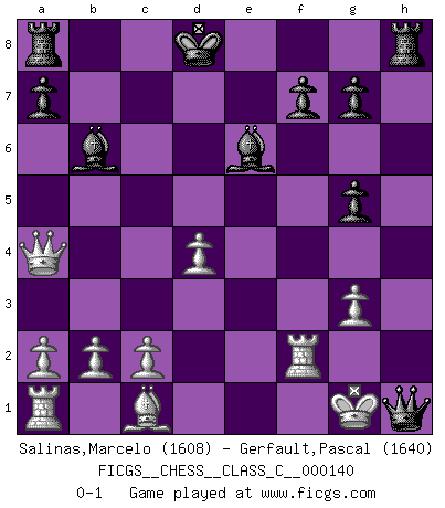 Last move : 0-1 2010 May 7 8:32:30 [Event "FICGS__CHESS__CLASS_C__000140"] [Site "FICGS"] [Date "2010.03.13"] [Round "1"] [White "Salinas,Marcelo"] [Black "Gerfault,Pascal"] [Result "0-1"] [WhiteElo "1608"] [BlackElo "1640"] 1.e4 e5 2.Bc4 Nf6 3.Nf3 Nc6 4.Ng5 d5 5.exd5 Na5 6.Bb5 c6 7.dxc6 bxc6 8.Ba4 h6 9.Qf3 hxg5 10.Bxc6 Nxc6 11.Qxc6 Bd7 12.Qb7 Be7 13.O-O e4 14.Nc3 Bd6 15.Nxe4 Bxh2+ 16.Kh1 Bc7 17.Kg1 Nxe4 18.Qxe4 Be6 19.g3 Qd5 20.Qa4+ Kd8 21.f3 Bb6+ 22.Rf2 Qxf3 23.d4 Qh1+ 0-1 Bishop's Opening : Berlin defense Kingside Castling by player White (move 13) Player Black won this chess game. Follow this game move after move (download)Different people feel differently about resigning. (Bobby Fischer) Ein typischer, sehr verbreiteter Gedankenschädling ist der, daß der betreffende Amateur von der Annanhme ausgeht, daß jeder einzelne Zug etwas zu leisten habe. (Aaron Nimzowitsch) El hombre es un frívolo, una creatura engañosa y como un jugador de Ajedrez, se preocupa mas por el proceso de obtener su meta que de la meta por sí misma. (Dostoyevsky) Des idées, des idées, j'en ai cent, j'en ai mille. Des bonnes, des mauvaises, applicables, irréalisables... Il suffit de faire le tri ! (Roos) The right perception of any matter and a misunderstanding of the same matter do not wholly exclude each other. (Kafka's the trial)