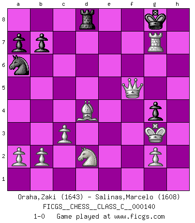 Last move : 1-0 2010 October 31 9:41:15 [Event "FICGS__CHESS__CLASS_C__000140"] [Site "FICGS"] [Date "2010.03.13"] [Round "1"] [White "Oraha,Zaki"] [Black "Salinas,Marcelo"] [Result "1-0"] [WhiteElo "1643"] [BlackElo "1608"] 1.d4 e6 2.e4 Bb4 3.c3 Ba5 4.f4 d5 5.e5 Ne7 6.Bd3 O-O 7.Nf3 Na6 8.O-O c5 9.Bxh7+ Kxh7 10.Ng5+ Kg6 11.Qd3+ f5 12.Qg3 Qe8 13.Nxe6 Kf7 14.Ng5+ Kg8 15.Qh4 Qg6 16.Rf3 Qh6 17.Qf2 Qh5 18.Be3 cxd4 19.Bxd4 Ng6 20.Nd2 Nxf4 21.Nh3 Nxh3+ 22.Rxh3 Qg4 23.Rg3 Qh5 24.e6 g5 25.e7 Re8 26.Qf4 g4 27.Qe5 Qh6 28.Re1 Bc7 29.Qxd5+ Be6 30.Rxe6 Rad8 31.Qxf5 Qxh2+ 32.Kxh2 Bxg3+ 33.Kxg3 Rxe7 34.Rg6+ Rg7 35.Rxg7+ 1-0 This chess game has been lost on time (started : 2010.03.13 21:15:13) Queen's pawn Kingside Castling by player Black (move 6) Kingside Castling by player White (move 8) Player White won this chess game. Follow this game move after move (download)Chess is a cold bath for the mind. (Sir John Simon) Rubinstein ist ein Turmendspiel, welches die Götter vor tausenden von Jahren begannen. (Savielly Grigorievitsch Tartakower) No soy una persona materialista y por eso, no resiento la falta o pérdida del dinero. La ausencia de cosas mundanas carece de importancia. Ya que el Ajedrez es una forma en la que puedo ser tan materialista como yo desee sin tener la necesidad de vender mi alma. (Jamie Walter Adams) Le temps de noter son nom sur la feuille de partie, j'étais déjà en zeitnot ! D'un modeste amateur apparié lors de la première ronde d'un open contre le grand-maître Azmaïparashvili. I have opinions of my own - strong opinions - but I don't always agree with them. (George Bush)