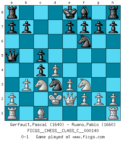 Last move : 0-1 2010 April 19 22:16:58 [Event "FICGS__CHESS__CLASS_C__000140"] [Site "FICGS"] [Date "2010.03.13"] [Round "1"] [White "Gerfault,Pascal"] [Black "Ruano,Pablo"] [Result "0-1"] [WhiteElo "1640"] [BlackElo "1660"] 1.d4 Nf6 2.c4 d5 3.Nc3 Nc6 4.e3 Bf5 5.Bd3 Bxd3 6.Qxd3 Nb4 7.Qe2 dxc4 8.Nf3 Nd3+ 9.Kd2 c5 10.b3 Qa5 0-1 Queen's pawn game Player Black won this chess game. Follow this game move after move (download)All my games are real. (Bobby Fischer) Computer sind die einzigen Gegner, die nicht immer eine Ausrede auf Lager haben, wenn sie gegen mich verlieren. (Robert James Fischer) El Ajedrez es imaginación. (David Bronstein) Les échecs, c'est l'art d'analyser. (Mikhail Botvinnik) As the days dwindle down... to a precious few. (Maxwell Anderson)