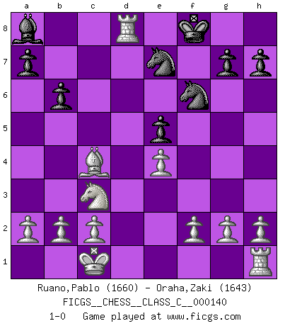 Last move : 1-0 2010 June 19 7:8:6 [Event "FICGS__CHESS__CLASS_C__000140"] [Site "FICGS"] [Date "2010.03.13"] [Round "1"] [White "Ruano,Pablo"] [Black "Oraha,Zaki"] [Result "1-0"] [WhiteElo "1660"] [BlackElo "1643"] 1.e4 e5 2.Nf3 Nc6 3.Bc4 Be7 4.d4 d6 5.dxe5 dxe5 6.Qxd8+ Bxd8 7.Be3 Nf6 8.Nc3 O-O 9.Bc5 Re8 10.Ng5 Re7 11.Bxe7 Nxe7 12.Nxf7 Kf8 13.Nxd8 b6 14.O-O-O Bb7 15.Ne6+ Ke8 16.Nxc7+ Kf8 17.Nxa8 Bxa8 18.Rd8+ 1-0 Hungarian defense Kingside Castling by player Black (move 8) Queenside Castling by player White (move 14) Player White won this chess game. Follow this game move after move (download)The sign of a great Master is his ability to win a won game quickly and painlessly. (Irving Chernev) Drei Punkte vor allen anderen ist wie einer, der im weißen Anzug posiert, während der Rest in Müllsäcke gekleidet dasteht. (Viktor Kortschnoi) En un gambito tu regalas un Peón por el bién de tomar un juego perdido. (Samuel Standige Boden) Les échecs sont un jeu par leur forme, un art par leur essence et une science par sa difficulté d'acquisition. Ils peuvent vous procurer autant de plaisir qu'un bon livre ou une belle musique, mais vous n'aurez une réelle joie que si vous arrivez à bien jouer. (Tigran Petrosian) The man who strikes first admits that his ideas have given out. (Chinese proverb)