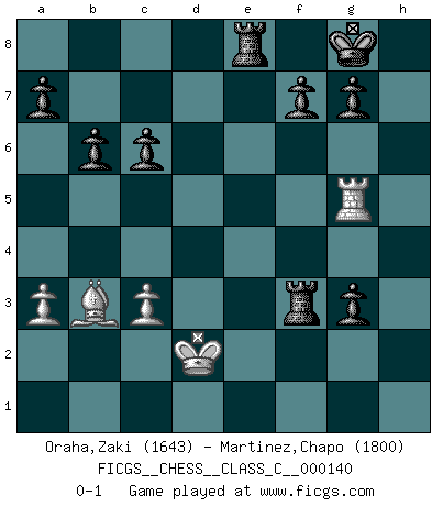 Last move : 0-1 2010 June 28 11:40:27 [Event "FICGS__CHESS__CLASS_C__000140"] [Site "FICGS"] [Date "2010.03.13"] [Round "1"] [White "Oraha,Zaki"] [Black "Martinez,Chapo"] [Result "0-1"] [WhiteElo "1643"] [BlackElo "1800"] 1.d4 Nf6 2.c4 e6 3.Nc3 Bb4 4.Bd2 b6 5.a3 Bxc3 6.Bxc3 Ne4 7.Qc2 Bb7 8.Nf3 Qf6 9.Rc1 O-O 10.Nd2 Nxf2 11.Rg1 Qh4 12.g3 Qxh2 13.Nf3 Bxf3 14.exf3 Qxg1 15.Qxf2 Qxf2+ 16.Kxf2 Nc6 17.Bd3 Rfe8 18.Rh1 h6 19.d5 exd5 20.cxd5 Ne7 21.Bc4 c6 22.dxc6 dxc6 23.g4 Rad8 24.f4 Nd5 25.g5 Nxc3 26.bxc3 Re4 27.Bb3 Rxf4+ 28.Ke3 hxg5 29.Rh5 Re8+ 30.Kd3 Rf3+ 31.Kd2 g4 32.Rg5 g3 0-1 Nimzo-Indian defense Kingside Castling by player Black (move 9) Player Black won this chess game. Follow this game move after move (download)Fischer was a master of clarity and a king of artful positioning. His opponents would see where he was going but were powerless to stop him. (Bruce Pandolfini) Jeder Fehler erscheint unglaublich dumm, wenn andre ihn begehen. (Georg Christoph Lichtenberg) Tu eres para mi la Reina en d8 y yo soy el Peón en d7!!. (GM Eduard Gufeld) On n'a jamais que l'âge auquel on a commence à jouer aux échecs car après on cesse de vieillir. (Capablanca) Perseverance does not equal worthiness. Next time you want to get my attention, wear something fun. Low-riding jeans are hot. (Gregory House, House M.D.)