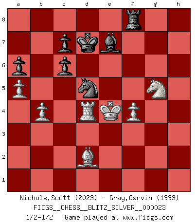 Last move : 1/2-1/2 2010 March 14 18:33:42 [Event "FICGS__CHESS__BLITZ_SILVER__000023"] [Site "FICGS"] [Date "2010.03.14"] [Round "1"] [White "Nichols,Scott"] [Black "Gray,Garvin"] [Result "1/2-1/2"] [WhiteElo "2023"] [BlackElo "1993"] 1.e4 e5 2.d4 exd4 3.c3 d5 4.exd5 Qxd5 5.Nf3 Nc6 6.cxd4 Bg4 7.Be2 Bb4+ 8.Nc3 Bxf3 9.Bxf3 Qc4 10.Bxc6+ bxc6 11.Qe2+ Qxe2+ 12.Kxe2 O-O-O 13.Be3 Ne7 14.a3 Ba5 15.Rhd1 Nf5 16.g4 Ne7 17.Ne4 Bb6 18.Rac1 f5 19.Ng5 Rde8 20.h3 h5 21.Kf3 fxg4+ 22.hxg4 Rhf8+ 23.Kg3 hxg4 24.Kxg4 Nd5 25.Rd3 Rf6 26.b4 Kb7 27.Kg3 Rg6 28.Kg4 Rf8 29.Kh5 Rh6+ 30.Kg4 a6 31.Re1 Rg6 32.f4 Rh8 33.Bd2 Rgh6 34.a4 Rh2 35.Kf3 Ba7 36.Re5 Kb6 37.Re6 Rh1 38.Re1 Rxe1 39.Bxe1 Kb7 40.Bd2 Kc8 41.Ke4 Re8+ 42.Kf5 Kd7 43.Kg6 Rf8 44.Kxg7 Rf5 45.Rf3 Bxd4+ 46.Kg6 Rf8 47.Kh5 Rb8 48.a5 Rh8+ 49.Kg4 Bf6 50.Rd3 Re8 51.Kf5 Be7 52.Rd4 Rf8+ 53.Ke4 Bd6 54.Kf3 Be7 55.Ke4 1/2-1/2 Danish gambit : Soerensen defense Queenside Castling by player Black (move 12) This chess game ended in a draw. Follow this game move after move (download)Openings teach you openings. Endgames teach you chess ! (Stephan Gerzadowicz) Der zweitbeste Zug ist oft der einzig richtige. (Savielly Grigorievitsch Tartakower) EL Ajedrez es como la vida. (Boris Spassky) La victoire dans une partie d'Echecs appartient la plupart du temps à celui qui voit un peu plus loin que l'adversaire. (Lasker) The only sure thing about luck is that it will change. (Wilson Mizner)