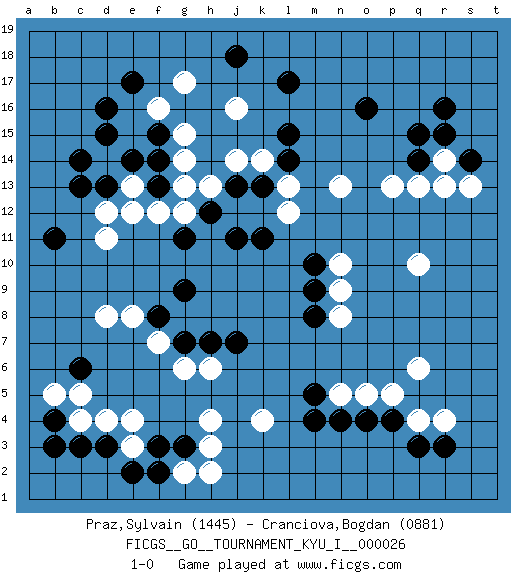 Last move : 1-0 2010 June 27 20:42:19 [Event "FICGS__GO__TOURNAMENT_KYU_I__000026"] [Site "FICGS"] [Date "2010.03.15"] [Round "1"] [Black "Praz,Sylvain"] [White "Cranciova,Bogdan"] [Result "1-0"] [Rating 1 "1445"] [Rating 2 "0881"] 1.r16 d4 2.d16 r4 3.l17 r14 4.q15 p13 5.o16 q10 6.p4 q6 7.r3 q4 8.q3 p5 9.o4 o5 10.n4 k4 11.c6 d8 12.c3 c4 13.d3 e4 14.b4 b5 15.b3 c5 16.f3 g17 17.e17 d14 18.f15 j16 19.l15 j14 20.f13 d11 21.k13 k14 22.l14 l13 23.j13 h13 24.j11 l12 25.k11 g14 26.f14 g15 27.j18 g12 28.h12 g13 29.g11 f12 30.d13 d12 31.c13 e13 32.e14 e12 33.c14 f16 34.d15 n13 35.g9 n5 36.m4 h3 37.g3 h4 38.m10 n10 39.m9 n9 40.m8 n8 41.m5 f7 42.g7 g6 43.h7 h6 44.f8 e8 45.j7 e3 46.e2 g2 47.f2 h2 48.q14 q13 49.s14 s13 50.r15 r13 51.b11 1-0 Here are the names of the openings (joseki) played in the four corners : Corner q4 : r4 p4 Komoku (Somok, Xiao~mu`) 3-4 Point. The komoku (3-4) point is the traditional corner enclosure move.. Ikken Takagakari (Hankan Nop'dakeolch'im, Yi Gaogua`jiao~, 1-Space High Approach). The 5-4 approach move has become more popular in modern times, as modern Go emphasizes speed and influence. Corner d4 : d4 c6 Hoshi (Hwajeom, Seongjeom, Xingwei`) 4-4 Point. The star or hoshi (4-4) point, emphasizing influence at the potential expense of territory. Ikken Kakari (Hankan Keolch'im, Yi Gua`jiao~, 1-Space Low Approach). Black 2 is the standard approach move to the 4-4. Corner d16 : d16 g17 Hoshi (Hwajeom, Seongjeom, Xingwei`) 4-4 Point. The star or hoshi (4-4) point, emphasizing influence at the potential expense of territory. Niken Kakari (Dukan Keolch'im, E`r Gua`jiao~, 2-Space Low Approach). Black typically answers by 7-3 or 3-5 (which is not joseki). Player Black won this Go (weiqi, baduk) game. Follow this game move after move (download)Go is to western chess what philosophy is to double entry accounting. (from Shibumi, by Trevanian) An expert is a man who has made all the mistakes which can be made in a very narrow field. (Niels Bohr)