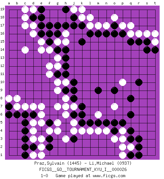 Last move : 1-0 2010 April 2 17:24:23 [Event "FICGS__GO__TOURNAMENT_KYU_I__000026"] [Site "FICGS"] [Date "2010.03.15"] [Round "1"] [Black "Praz,Sylvain"] [White "Li,Michael"] [Result "1-0"] [Rating 1 "1445"] [Rating 2 "0937"] 1.r15 d16 2.q4 d4 3.f3 j4 4.c3 d3 5.c4 d5 6.d2 e2 7.c2 e3 8.c6 e7 9.f17 c7 10.b6 c14 11.d18 c17 12.j17 q17 13.p16 p17 14.o16 n17 15.r10 o3 16.q6 q2 17.r3 m4 18.n16 m17 19.m16 l17 20.k15 p10 21.q8 o7 22.o9 b7 23.d6 e6 24.f2 e1 25.f5 e5 26.j3 h3 27.h4 g4 28.h5 f4 29.m9 j5 30.j6 h6 31.h7 g5 32.k6 h16 33.h17 f16 34.e17 d7 35.c5 h8 36.h9 j7 37.j8 g7 38.k7 h7 39.j9 g9 40.h11 g10 41.h12 f12 42.g16 g15 43.g17 h15 44.e16 e15 45.f15 f14 46.g14 f16 47.g11 f11 48.f15 e14 49.h14 f16 50.o5 m6 51.f15 r16 52.s15 q16 53.q15 s16 54.f16 t15 55.t14 t16 56.s14 k18 57.a7 a8 58.a6 b8 59.r2 p3 60.l5 l4 61.m5 n4 62.n5 c18 63.j18 d19 64.e19 c19 65.q1 p1 66.r1 j19 67.h19 k19 68.q3 p2 69.k17 l18 70.o17 o18 71.l16 d17 72.e18 g13 73.h13 h10 74.j10 p4 75.p5 d1 76.c1 g12 77.k5 k4 78.o4 1-0 Here are the names of the openings (joseki) played in the four corners : Corner d4 : d4 f3 Hoshi (Hwajeom, Seongjeom, Xingwei`) 4-4 Point. The star or hoshi (4-4) point, emphasizing influence at the potential expense of territory. Ikken Kakari (Hankan Keolch'im, Yi Gua`jiao~, 1-Space Low Approach). Black 2 is the standard approach move to the 4-4. Corner d16 : d16 f17 Hoshi (Hwajeom, Seongjeom, Xingwei`) 4-4 Point. The star or hoshi (4-4) point, emphasizing influence at the potential expense of territory. Ikken Kakari (Hankan Keolch'im, Yi Gua`jiao~, 1-Space Low Approach). Black 2 is the standard approach move to the 4-4. Corner q16 : r15 q17 Mokuhazushi (Waemok, Wai`mu`) 5-3 Point. The mokuhazushi (5-3) point was popular in the Edo period in Japan (1600 - 1867). It emphasizes influence; territorially, it is inferior to the 3-4 point. Komoku Kakari. White 2 is the standard approach because of its solidity and stability. Corner q4 : q4 o3 Hoshi (Hwajeom, Seongjeom, Xingwei`) 4-4 Point. The star or hoshi (4-4) point, emphasizing influence at the potential expense of territory. Ikken Kakari (Hankan Keolch'im, Yi Gua`jiao~, 1-Space Low Approach). White 2 is the standard approach move to the 4-4. Player Black won this Go (weiqi, baduk) game. Follow this game move after move (download)Nothing requires doing this or that, but necessity exists. (Pierre Audouard) Computers are like Old Testament gods; lots of rules and no mercy. (Joseph Campbell)