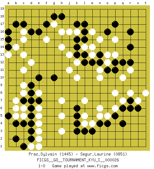 Last move : 1-0 2010 August 15 23:5:34 [Event "FICGS__GO__TOURNAMENT_KYU_I__000026"] [Site "FICGS"] [Date "2010.03.15"] [Round "1"] [Black "Praz,Sylvain"] [White "Segur,Laurine"] [Result "1-0"] [Rating 1 "1445"] [Rating 2 "0851"] 1.r16 c16 2.e16 d12 3.q4 e4 4.c17 q10 5.c4 c6 6.d5 e6 7.d6 c8 8.d3 e3 9.d16 c15 10.q12 n15 11.k4 q7 12.q6 r11 13.r12 h3 14.k3 h5 15.k6 h7 16.k17 h16 17.k15 h14 18.k13 k10 19.p17 p8 20.n12 m14 21.l13 p15 22.o16 m16 23.l15 p13 24.p12 o13 25.n13 o12 26.o11 n11 27.r14 n10 28.p11 m13 29.m12 k12 30.l12 f15 31.b17 j11 32.f17 j13 33.h18 n6 34.n4 l7 35.d7 e8 36.e7 b5 37.b4 e2 38.d2 d1 39.c1 e1 40.b2 g17 41.g18 l14 42.k14 k16 43.l16 j16 44.l17 o5 45.o4 l5 46.k5 m4 47.m3 l4 48.l3 n5 49.p5 p6 50.r6 s7 51.r7 r8 52.s6 t8 53.c7 b7 54.d8 c9 55.d9 c11 56.e10 c5 57.a5 b6 58.d4 e5 59.a14 b14 60.a16 a13 61.a15 c13 62.g10 1-0 Here are the names of the openings (joseki) played in the four corners : Corner d16 : c16 e16 Komoku (Somok, Xiao~mu`) 3-4 Point. The komoku (3-4) point is the traditional corner enclosure move.. Ikken Takagakari (Hankan Nop'dakeolch'im, Yi Gaogua`jiao~, 1-Space High Approach). The 5-4 approach move has become more popular in modern times, as modern Go emphasizes speed and influence. Corner d4 : e4 c4 Takamoku (Gomok, Gaomu`) 5-4 Point. The takamoku (high) point (5-4). With its emphasis on influence, the 5-4 point complements the 4-4 (hoshi) point in creating an influence-oriented fuseki. Komoku. White responds with 3-3, 3-5, 4-6, 4-7, 3-6, 3-7. Corner q4 : q4 q7 Hoshi (Hwajeom, Seongjeom, Xingwei`) 4-4 Point. The star or hoshi (4-4) point, emphasizing influence at the potential expense of territory. Niken Takagakari (Dukan Nop'dakeolch'im, E`r Gaojia, 2-Space High Approach). White 2 is a light approach move. Rarely played in even games, White 2 is typically employed in handicap games. Black continues with 6-4 or 3-10. In Korean Sunjang Baduk Black has a stone on 8-4. Player Black won this Go (weiqi, baduk) game. Follow this game move after move (download)One big eye kills one small eye. (Anonymous) Life is painting a picture, not doing a sum. (Oliver Wendell Holmes, Jr.)