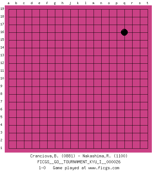 Last move : 1-0 2010 April 14 8:55:33 [Event "FICGS__GO__TOURNAMENT_KYU_I__000026"] [Site "FICGS"] [Date "2010.03.15"] [Round "1"] [Black "Cranciova,Bogdan"] [White "Nakashima,Richard"] [Result "1-0"] [Rating 1 "0881"] [Rating 2 "1100"] 1.q16 1-0 This go game has been lost on time (started : 2010.03.15 3:19:18) Here are the names of the openings (joseki) played in the four corners : Player Black won this Go (weiqi, baduk) game. Follow this game move after move (download)Eyes win semiais. (Anonymous) Man is reluctant to give credit for intelligence to anyone, except his enemies. (Albert Einstein)