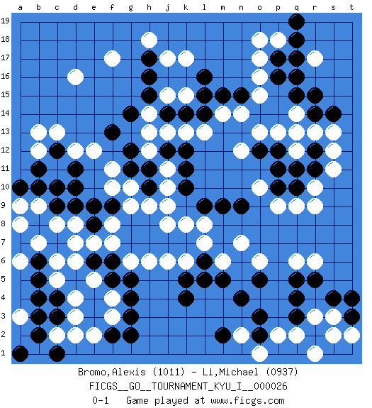 Last move : 0-1 2010 September 25 10:53:51 [Event "FICGS__GO__TOURNAMENT_KYU_I__000026"] [Site "FICGS"] [Date "2010.03.15"] [Round "1"] [Black "Bromo,Alexis"] [White "Li,Michael"] [Result "0-1"] [Rating 1 "1011"] [Rating 2 "0937"] 1.q16 d4 2.q4 d16 3.k10 r6 4.r5 q6 5.q5 r10 6.q10 r9 7.r11 q2 8.r2 p2 9.o3 r3 10.q3 s3 11.s4 s2 12.t3 t2 13.t4 r1 14.k4 o17 15.p17 o16 16.p16 k17 17.d10 c8 18.c9 d8 19.d9 c13 20.g14 f17 21.h16 k15 22.l14 r13 23.r15 s11 24.r12 s12 25.q13 q14 26.r14 s13 27.s14 q12 28.q11 p13 29.o12 o13 30.p12 q13 31.q15 o10 32.n9 q9 33.p10 p9 34.p11 n12 35.c3 d3 36.c4 c5 37.b5 c6 38.b6 b7 39.b4 c2 40.b2 d2 41.c1 a3 42.b3 b1 43.a1 a6 44.b8 b9 45.b10 a8 46.e8 e7 47.f6 e5 48.f5 f4 49.g4 f8 50.e9 f7 51.g7 o6 52.n4 n2 53.o2 o1 54.m2 f3 55.g3 c11 56.c10 e12 57.f13 f11 58.g11 f10 59.f9 g9 60.b11 b12 61.d11 d12 62.g8 g10 63.e6 d7 64.c12 b13 65.a10 a9 66.f2 e2 67.g2 j11 68.h11 j10 69.h10 h9 70.h8 j8 71.j7 j13 72.j12 h12 73.g12 h13 74.k12 k8 75.k7 l8 76.l9 l7 77.l6 n7 78.o5 m6 79.m5 p18 80.q18 o18 81.q19 r17 82.q17 k6 83.l5 g6 84.h7 j6 85.k5 h6 86.g5 d6 87.j14 k13 88.k14 l13 89.k11 j9 90.m9 h14 91.h15 j15 92.l15 j17 93.h17 h18 94.l16 m14 95.m15 n14 96.n15 o15 0-1 Here are the names of the openings (joseki) played in the four corners : Corner q4 : q4 r6 Hoshi (Hwajeom, Seongjeom, Xingwei`) 4-4 Point. The star or hoshi (4-4) point, emphasizing influence at the potential expense of territory. Ikken Kakari (Hankan Keolch'im, Yi Gua`jiao~, 1-Space Low Approach). White 2 is the standard approach move to the 4-4. Player White won this Go (weiqi, baduk) game. Follow this game move after move (download)In the corner, five stones in a row on the third line are alive. (Anonymous) Humor is by far the most significant activity of the human brain. (Edward De Bono)