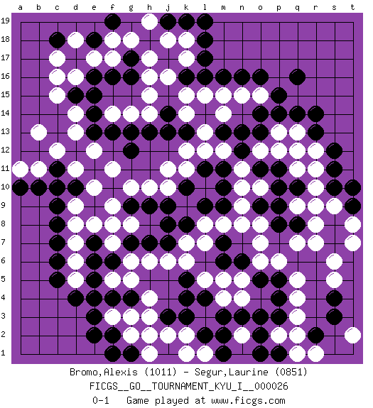 Last move : 0-1 2010 December 20 8:57:36 [Event "FICGS__GO__TOURNAMENT_KYU_I__000026"] [Site "FICGS"] [Date "2010.03.15"] [Round "1"] [Black "Bromo,Alexis"] [White "Segur,Laurine"] [Result "0-1"] [Rating 1 "1011"] [Rating 2 "0851"] 1.q16 d16 2.d4 q4 3.k10 f9 4.k16 r10 5.q10 r8 6.k4 h17 7.d10 d9 8.c9 f11 9.g12 e12 10.f13 h15 11.j14 q13 12.r14 o10 13.p9 o8 14.p8 p6 15.o5 o7 16.p4 q3 17.p3 m5 18.m6 n5 19.n6 l5 20.l4 k6 21.j7 k7 22.k8 l7 23.m7 l8 24.l9 m8 25.m9 o6 26.p5 n4 27.n3 m4 28.m3 q5 29.o3 q9 30.q8 r9 31.p10 p12 32.o13 n11 33.n12 j6 34.j8 f7 35.e6 d8 36.c8 d7 37.c7 d6 38.c6 d5 39.c5 d13 40.e14 d14 41.e15 f17 42.d15 c15 43.e16 e17 44.f16 g14 45.g16 h16 46.g17 g18 47.g13 h14 48.h13 f14 49.e13 h10 50.o9 n9 51.o11 n10 52.p11 o12 53.q12 p13 54.n13 r12 55.r13 k17 56.l17 j11 57.j13 l13 58.p14 q11 59.q14 q12 60.s12 r11 61.s11 k12 62.m11 m12 63.m13 l12 64.l11 g6 65.m10 n8 66.k5 h4 67.e5 e10 68.c10 f3 69.e3 f5 70.e4 b11 71.c11 c12 72.d12 d11 73.e7 e8 74.f4 g3 75.f2 g2 76.e2 k15 77.l16 l15 78.m16 n15 79.o14 m15 80.n16 o15 81.o16 k2 82.k3 j2 83.l2 p2 84.o2 q2 85.p1 q1 86.o1 l1 87.m1 n2 88.m2 k1 89.j3 h2 90.s10 s9 91.t9 q7 92.l14 k14 93.k13 m14 94.s8 r7 95.s7 s6 96.p15 k18 97.l18 j10 98.j9 k11 99.h9 g8 100.g9 g10 101.h7 h6 102.f6 g5 103.s3 t7 104.t10 t8 105.s4 s5 106.r2 t2 107.g1 h1 108.f1 r1 109.b10 a11 110.a10 b13 111.g4 h3 112.k19 j18 113.j19 h19 114.l19 j16 115.d17 c16 116.e18 f18 117.f19 d18 118.c18 c17 119.g7 f8 0-1 Here are the names of the openings (joseki) played in the four corners : Corner d4 : d4 f9 Hoshi (Hwajeom, Seongjeom, Xingwei`) 4-4 Point. The star or hoshi (4-4) point, emphasizing influence at the potential expense of territory. Corner q16 : q16 q13 Hoshi (Hwajeom, Seongjeom, Xingwei`) 4-4 Point. The star or hoshi (4-4) point, emphasizing influence at the potential expense of territory. Niken Takagakari (Dukan Nop'dakeolch'im, E`r Gaojia, 2-Space High Approach). White 2 is a light approach move. Rarely played in even games, White 2 is typically employed in handicap games. Black continues with 6-4 or 3-10. In Korean Sunjang Baduk Black has a stone on 8-4. Player White won this Go (weiqi, baduk) game. Follow this game move after move (download)You can hide nothing on the goban. (Pierre Audouard) Memory... is the diary that we all carry with us. (Oscar Wilde, The Importance of Being Earnest)