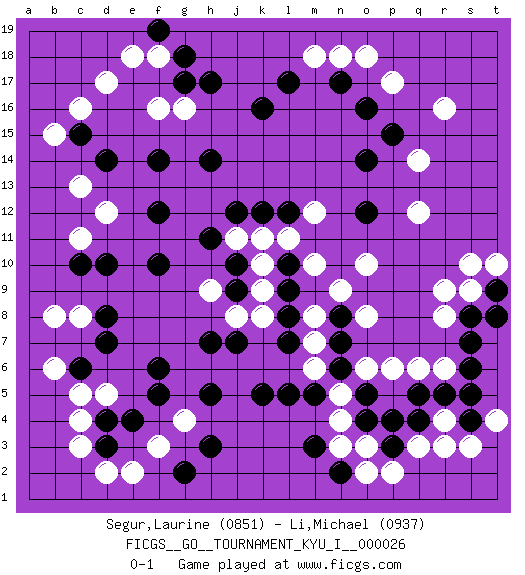 Last move : 0-1 2010 June 28 0:33:58 [Event "FICGS__GO__TOURNAMENT_KYU_I__000026"] [Site "FICGS"] [Date "2010.03.15"] [Round "1"] [Black "Segur,Laurine"] [White "Li,Michael"] [Result "0-1"] [Rating 1 "0851"] [Rating 2 "0937"] 1.d4 d17 2.q4 r16 3.c15 d12 4.d14 f16 5.f14 c16 6.h14 c13 7.f10 b15 8.f12 p17 9.d8 f3 10.h3 c3 11.d3 c4 12.c6 d2 13.f5 e2 14.h7 r9 15.k16 r6 16.r5 q6 17.m3 o3 18.p4 r3 19.o5 q3 20.s4 s3 21.n2 o2 22.l12 q12 23.n17 m10 24.o12 o10 25.k5 n4 26.m5 n5 27.n6 o6 28.s6 p6 29.s7 r8 30.s8 r4 31.q5 t4 32.s5 s9 33.t9 t10 34.t8 s10 35.o14 k10 36.j10 k11 37.j12 m6 38.n7 m7 39.n8 m8 40.g17 n9 41.l5 d5 42.e4 c5 43.f6 c8 44.d7 b6 45.d10 c11 46.c10 b8 47.o4 n3 48.p3 p2 49.p15 q14 50.o16 o18 51.f19 e18 52.g2 g4 53.h5 g16 54.h17 f18 55.g18 m18 56.l17 n18 57.l10 l11 58.l9 m12 59.k12 k9 60.l8 k8 61.l7 o8 62.j7 j11 63.h11 h9 64.j9 j8 0-1 Here are the names of the openings (joseki) played in the four corners : Corner d16 : d17 c15 Komoku (Somok, Xiao~mu`) 3-4 Point. The komoku (3-4) point is the traditional corner enclosure move.. Ikken Kakari (Hankan Keolch'im, Yi Gua`jiao~, 1-Space Low Pincer). The small knight move is the basic approach move to the 3-4 point stone. It has been continually used for over four centuries. There are limitless variations, with new moves constantly being discovered. Black 2 opens the door to a treaure store of joseki. Corner q4 : q4 r9 Hoshi (Hwajeom, Seongjeom, Xingwei`) 4-4 Point. The star or hoshi (4-4) point, emphasizing influence at the potential expense of territory. Player White won this Go (weiqi, baduk) game. Follow this game move after move (download)If White takes all four corners, Black should resign; if Black takes all four corners, Black should also resign. (David Kent) To send light into the darkness of men's hearts - such is the duty of the artist. (Schumann)